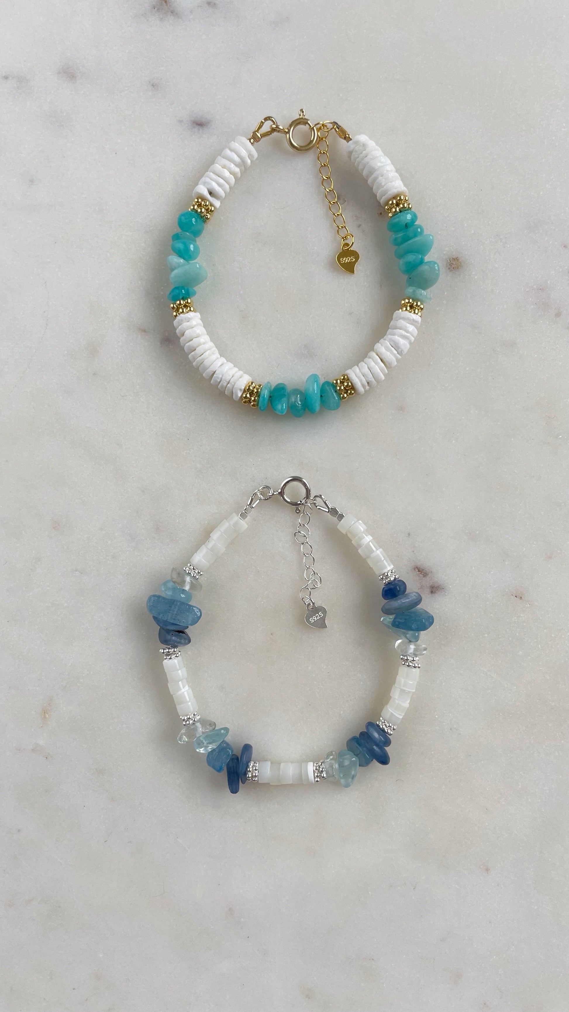 This stunning bracelet features natural Amazonite crystals, white shell heishi beads, and sterling silver (or gold plated) spacers.