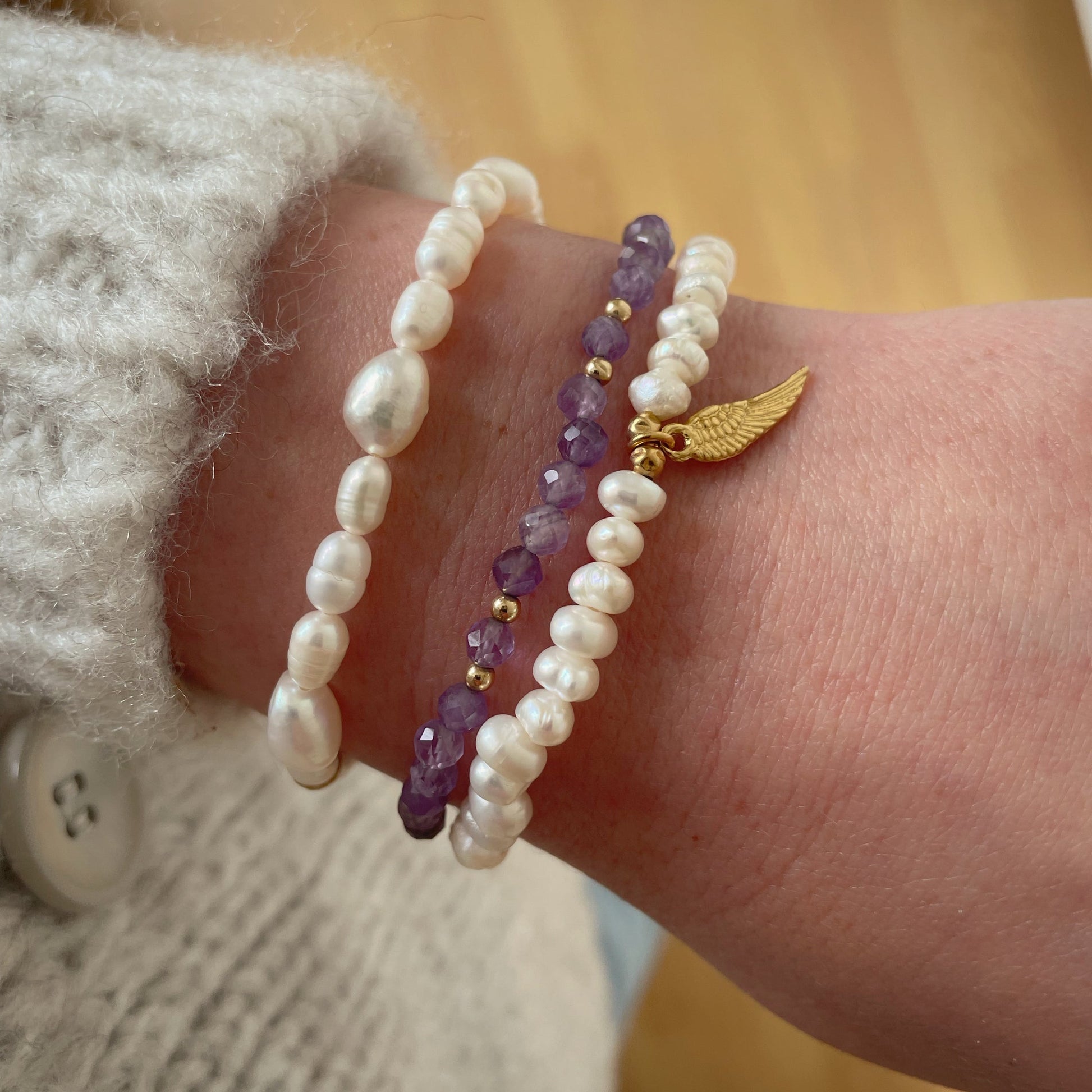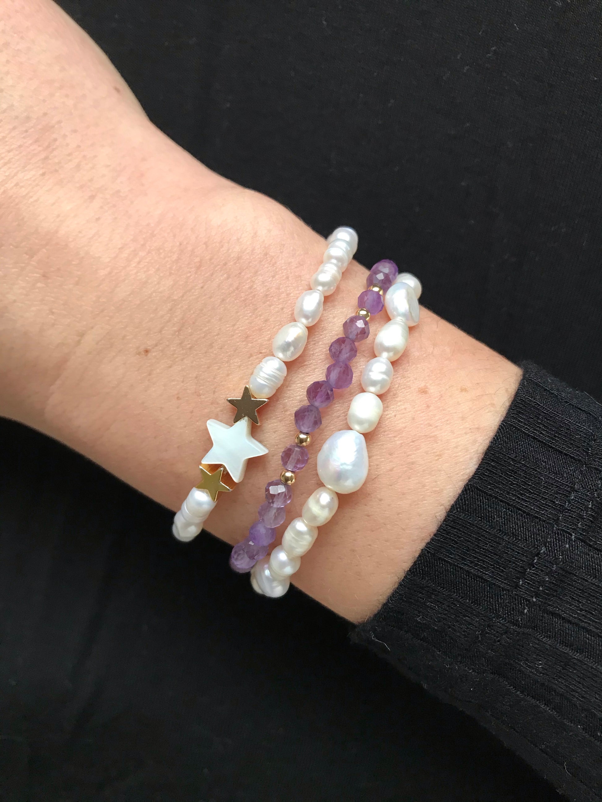 Elastic bracelet with natural Amethyst crystals, divided with silver or gold beads.