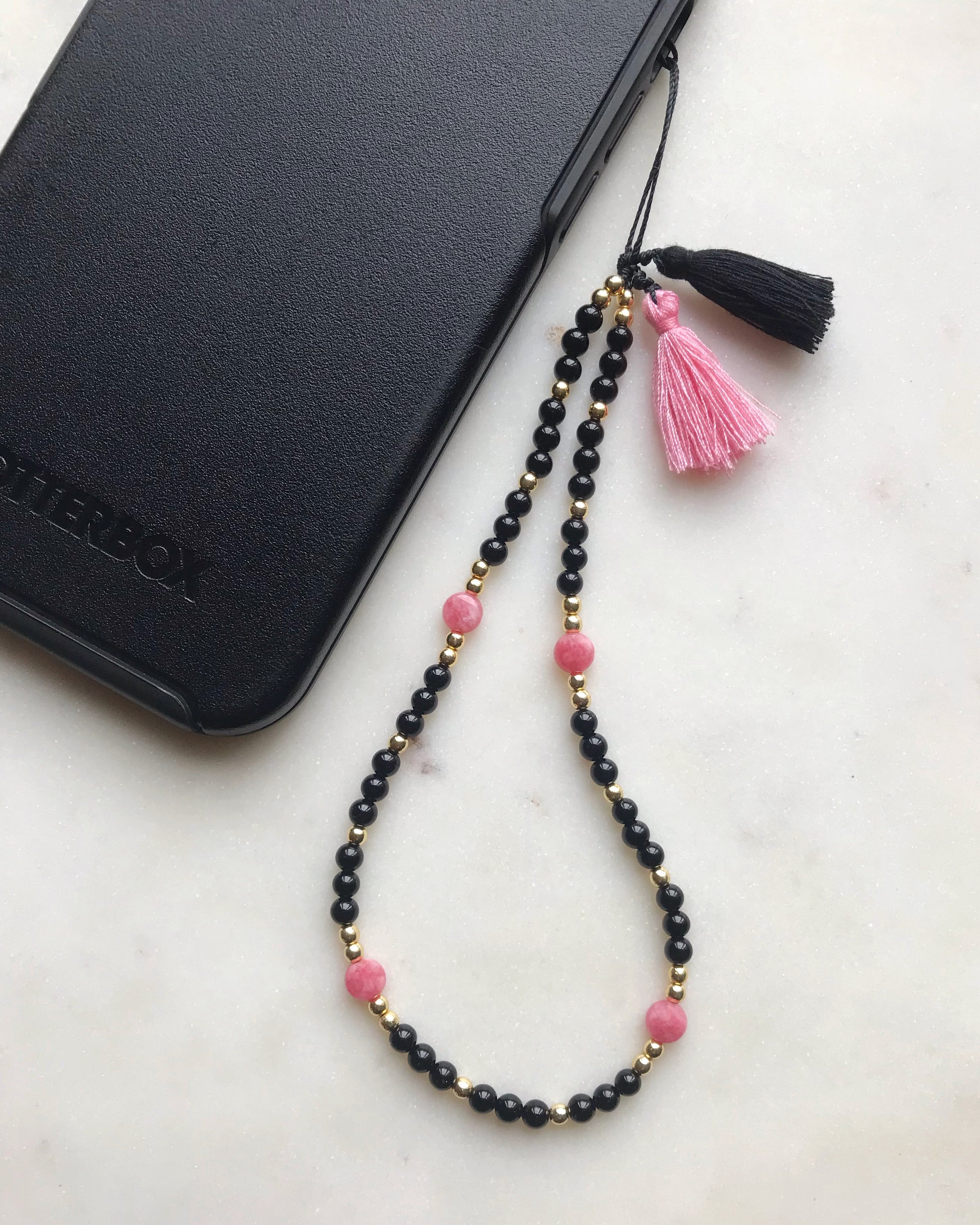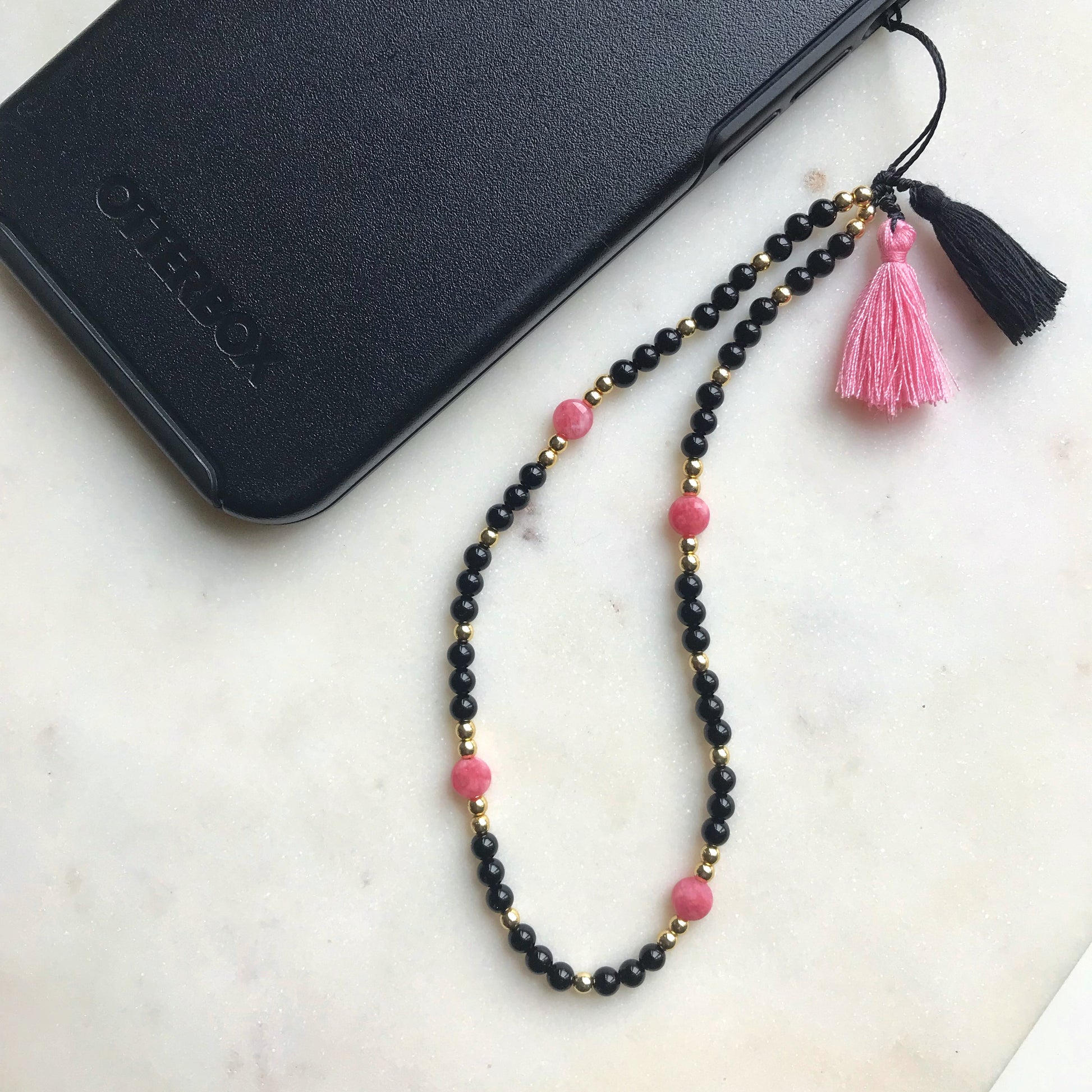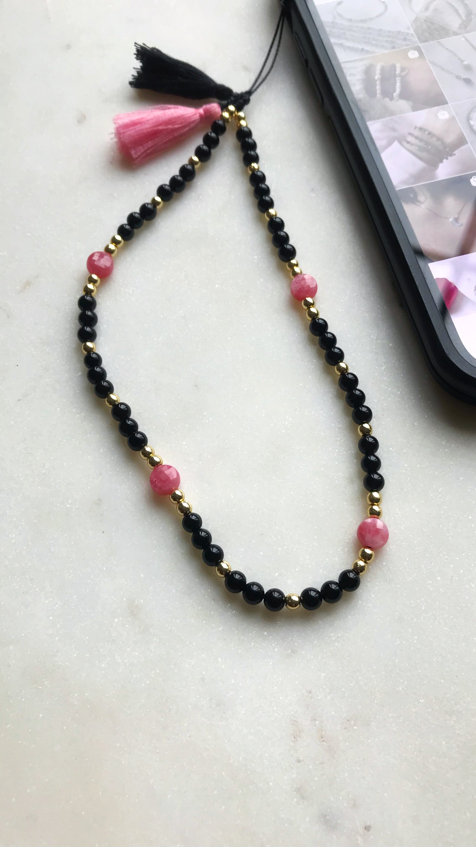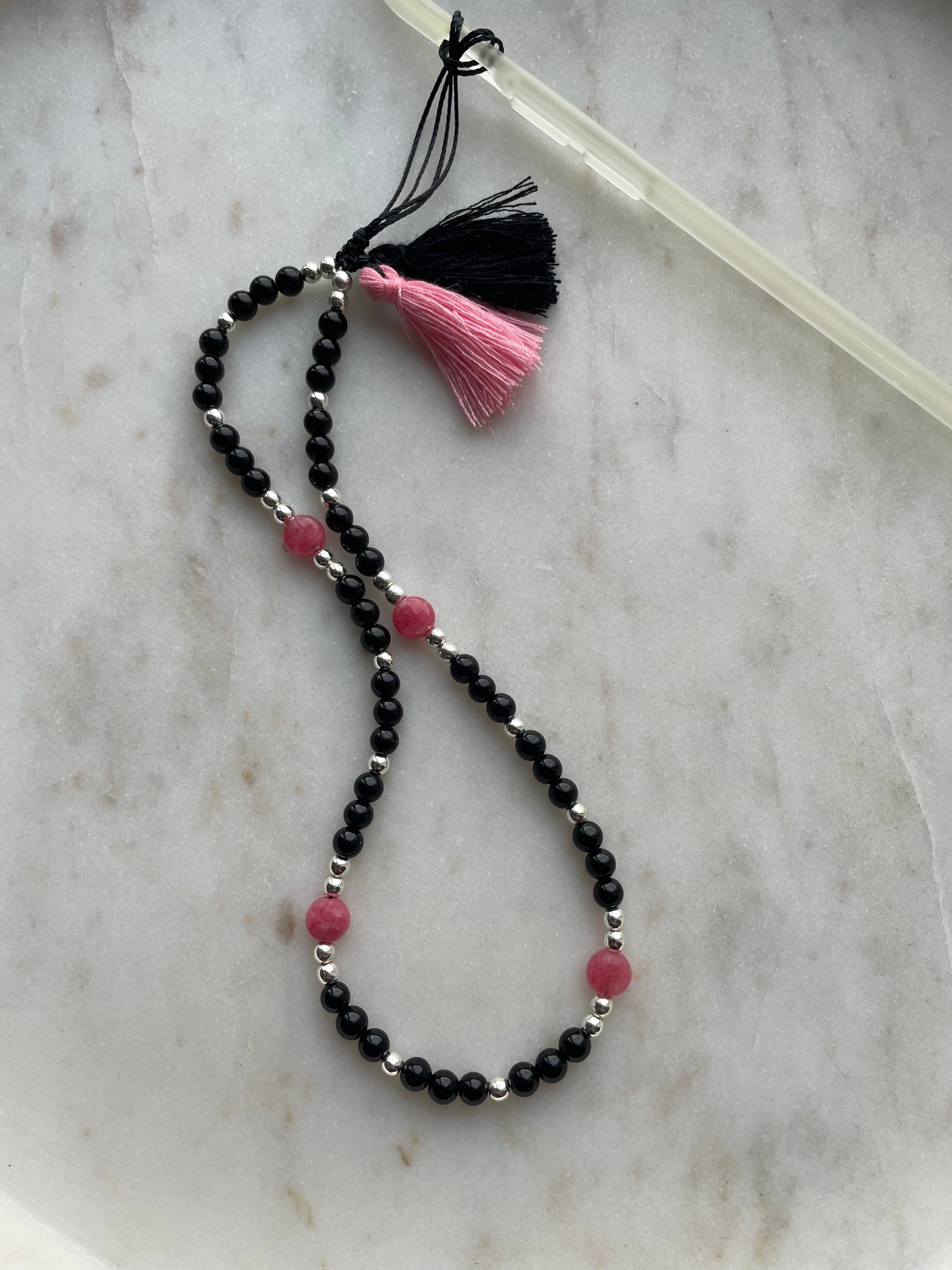 Combination of black onyx, hematite and juicy rhodochrosite beads to add a bit of colour.