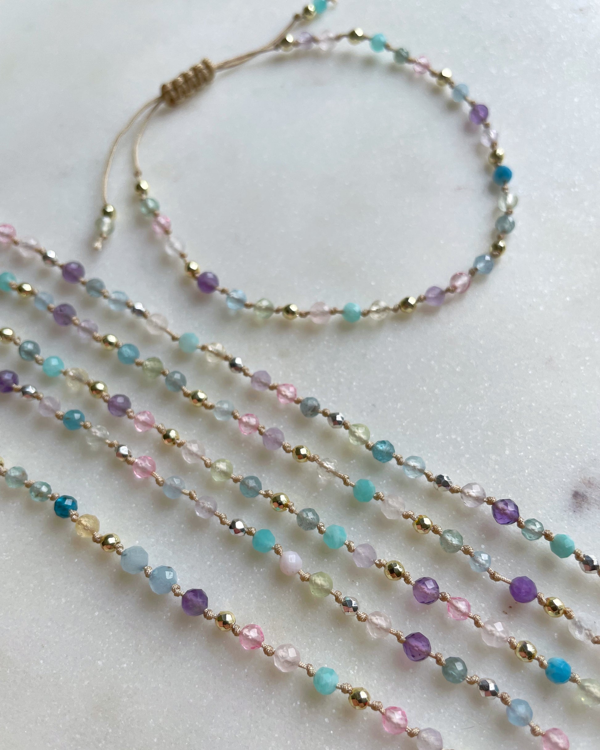 Each bracelet is different, created in chaos with colourful crystals like aquamarine, amethyst, amazonite, prehnite, apatite, rose quartz, citrine, lavender jade, pink opal and gold or silver hematite (depending on your preferences )