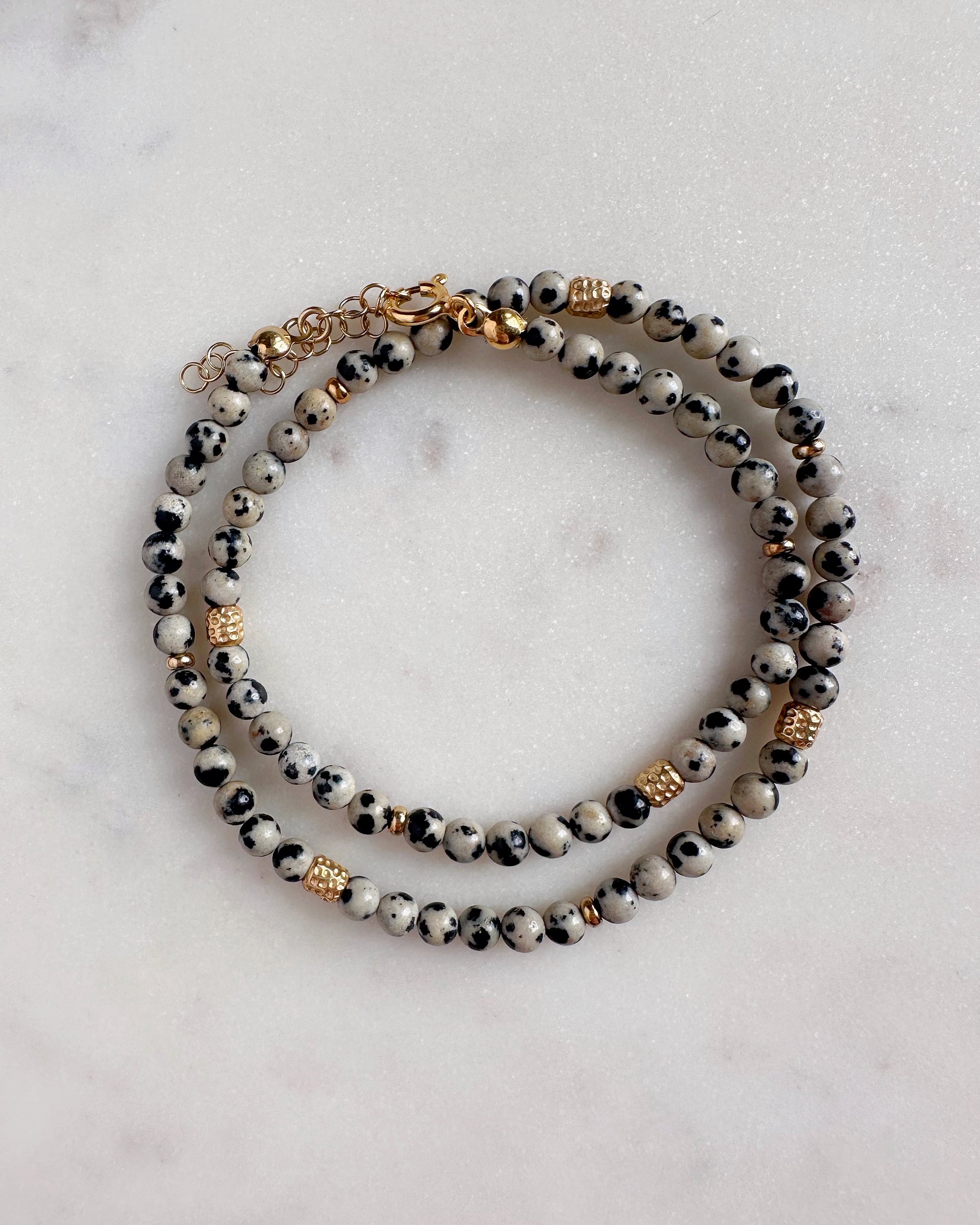 Dalmatian Jasper is known for its grounding energy and playful spirit, promoting a sense of joy, playfulness, and a sense of protection. It encourages exploration and spontaneity while offering protection against negativity, making it the perfect stone for enhancing personal strength. It is believed to inspire loyalty and companionship, making it a perfect accessory for those seeking to enhance friendships and emotional balance.