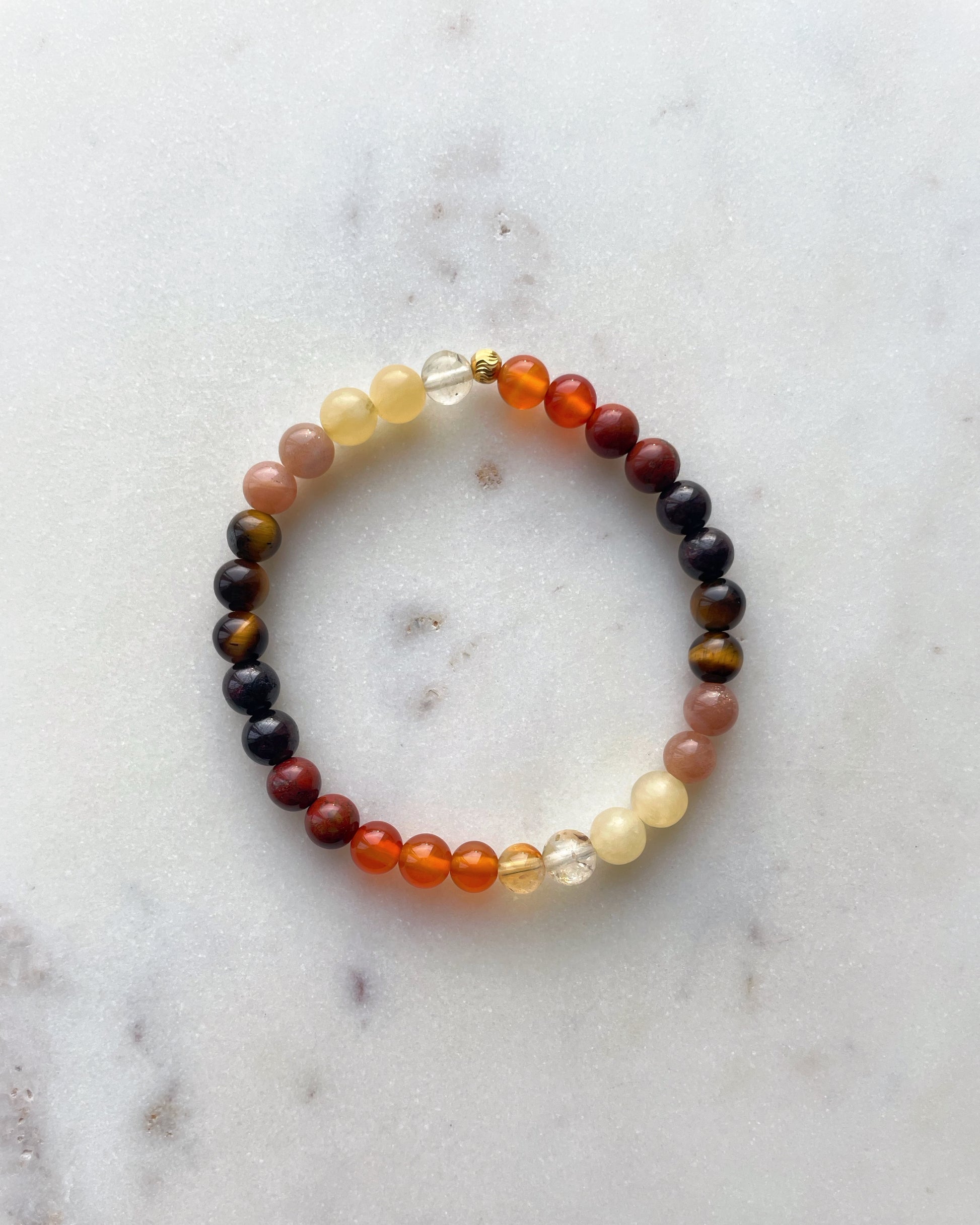 Bracelet with natural crystals : Carnelian, Garnet, Tiger eye, Red Jasper, Citrine, Sunstone, Yellow Jade.