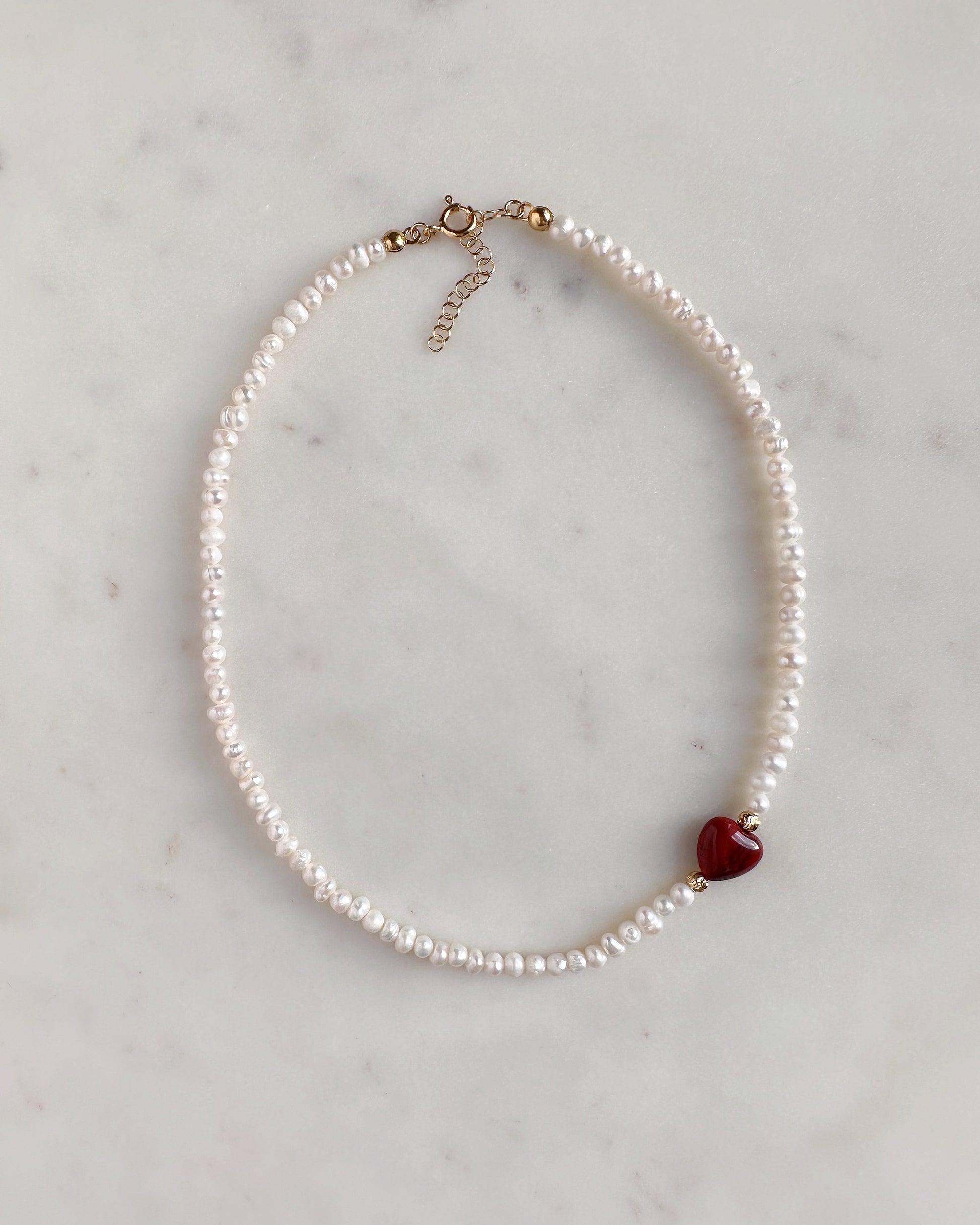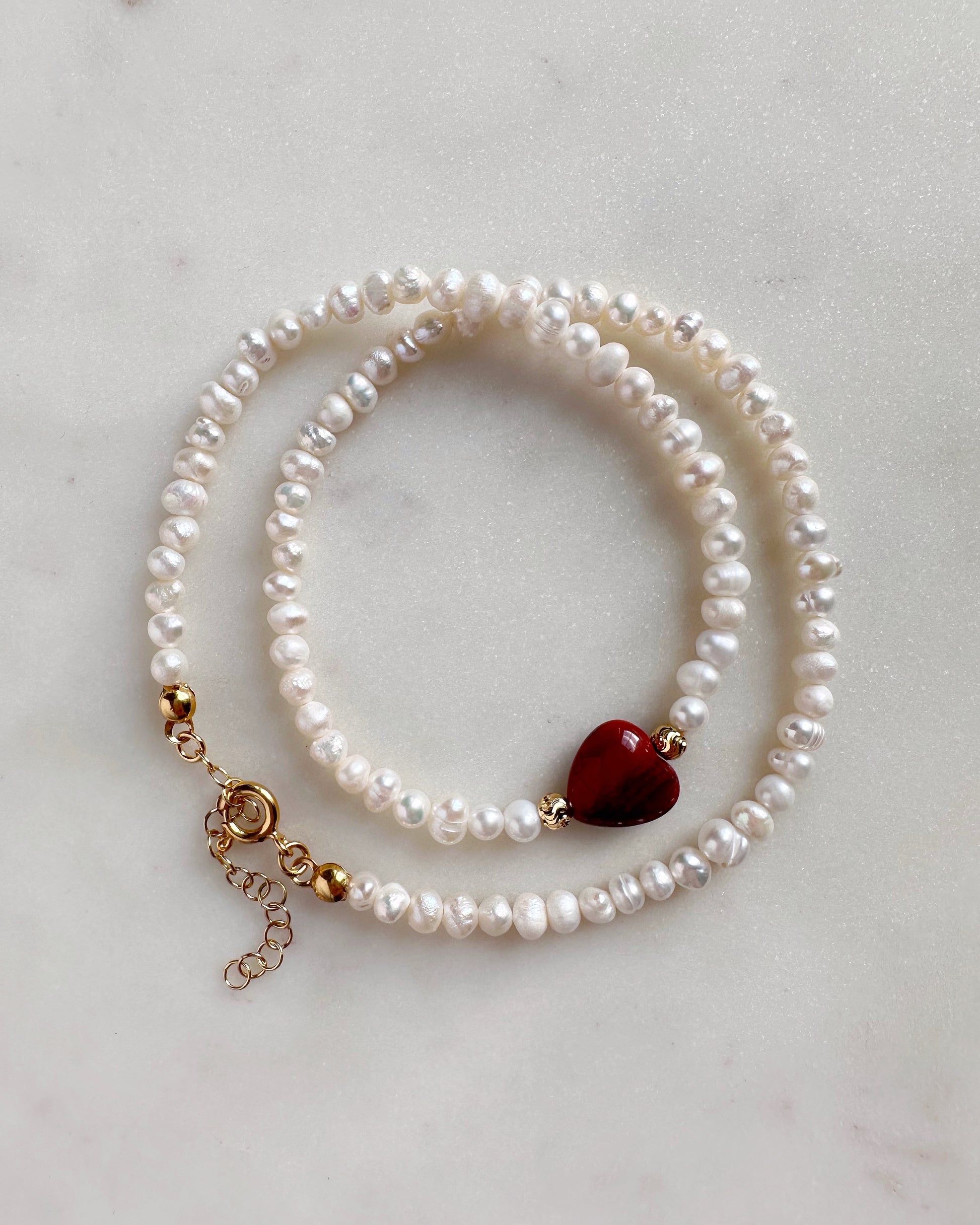 FREJA necklace with natural freshwater pearls and Red Jasper heart.