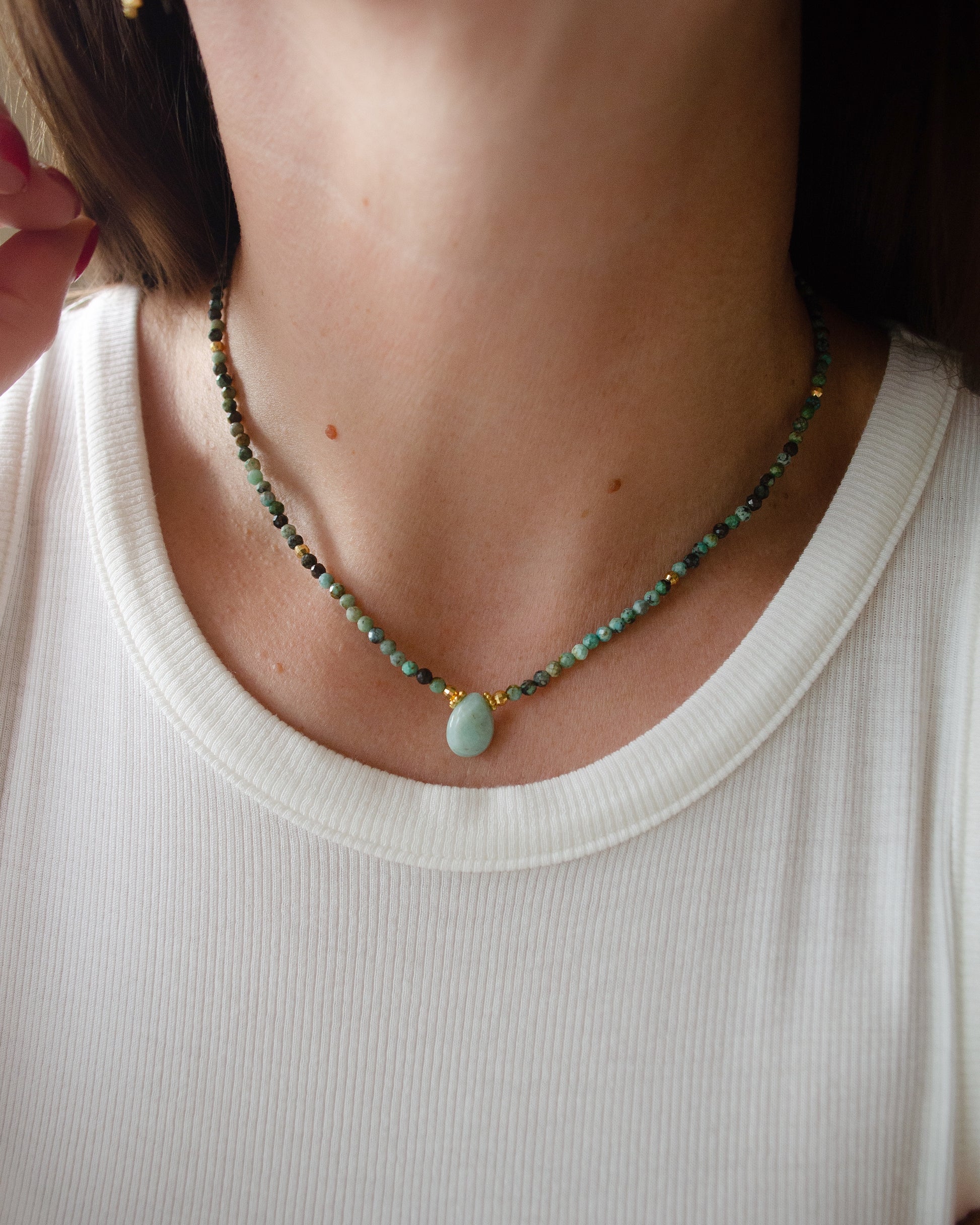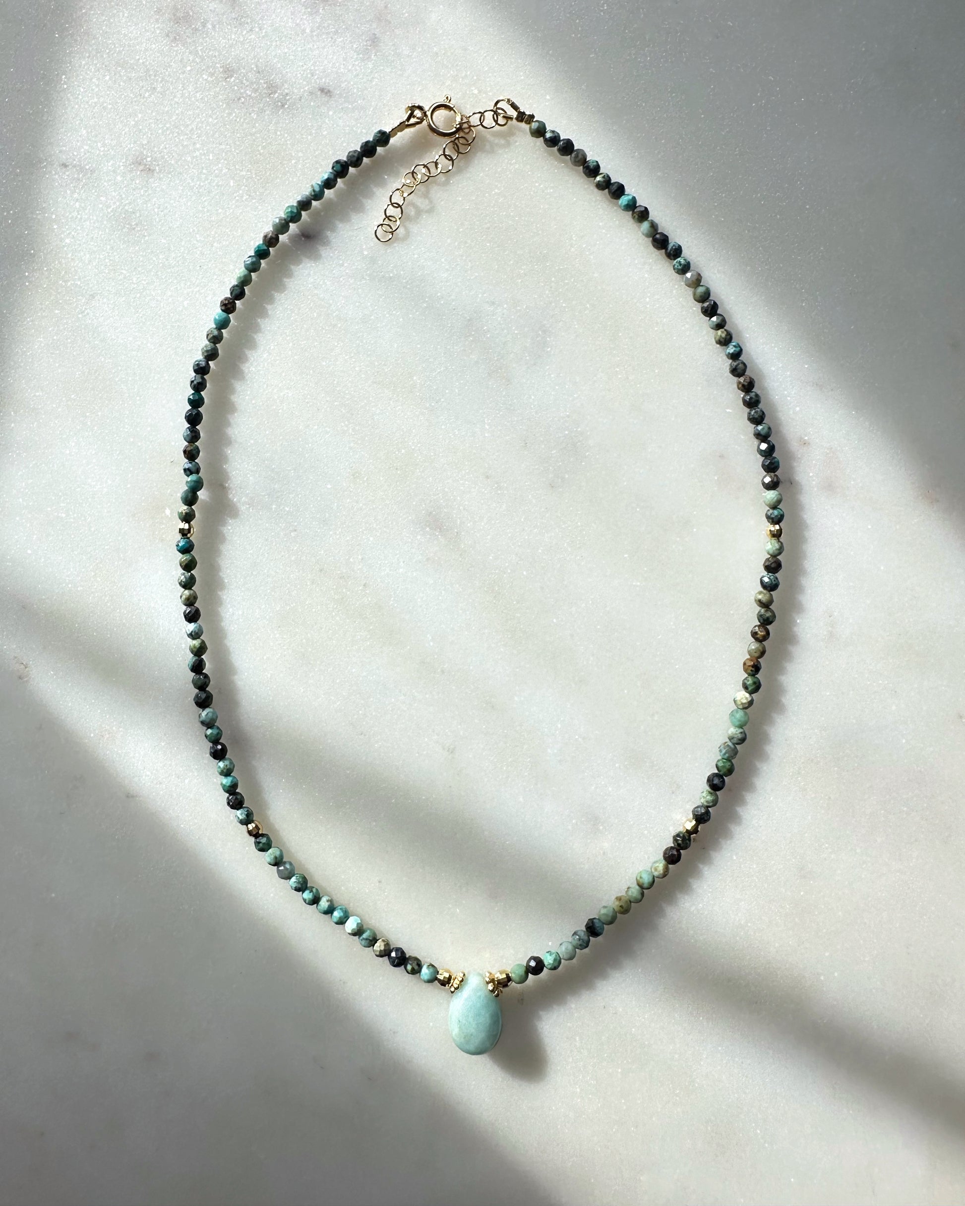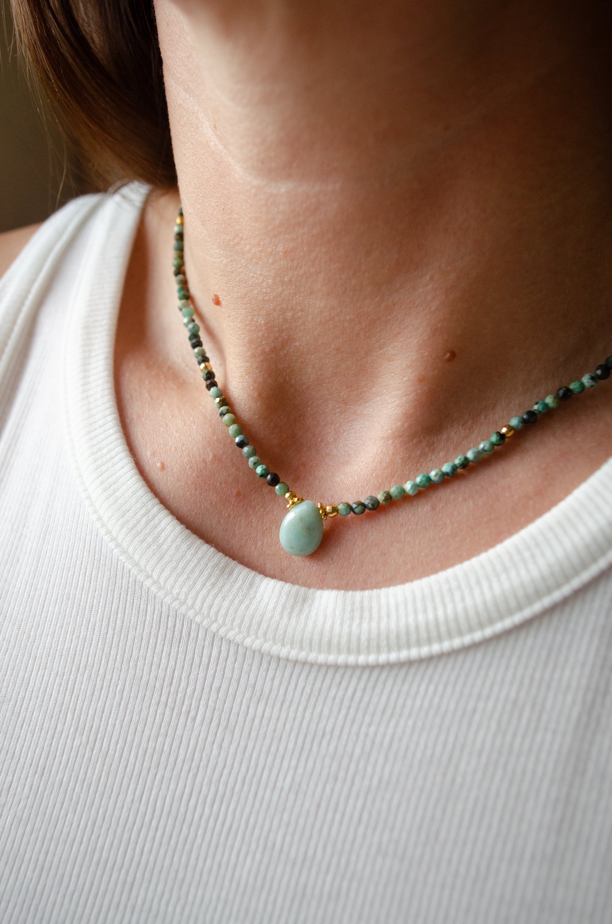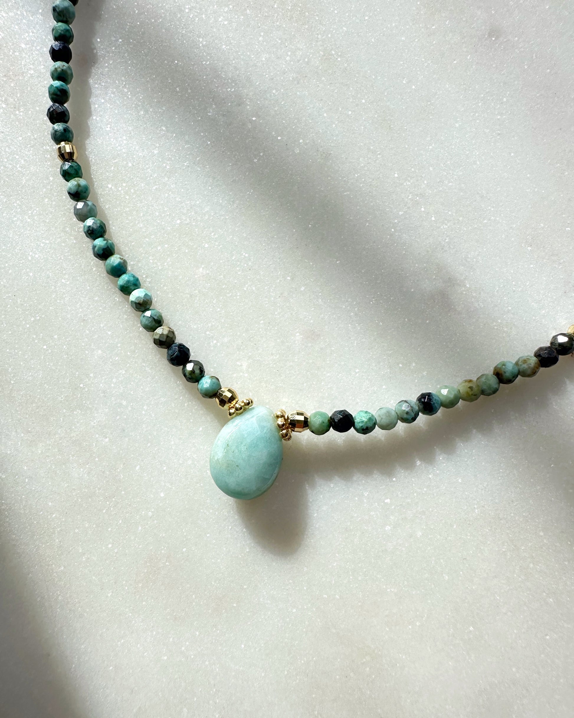 Gaya necklace with African Turquoise (jasper) beads and Amazonite drop in the middle.