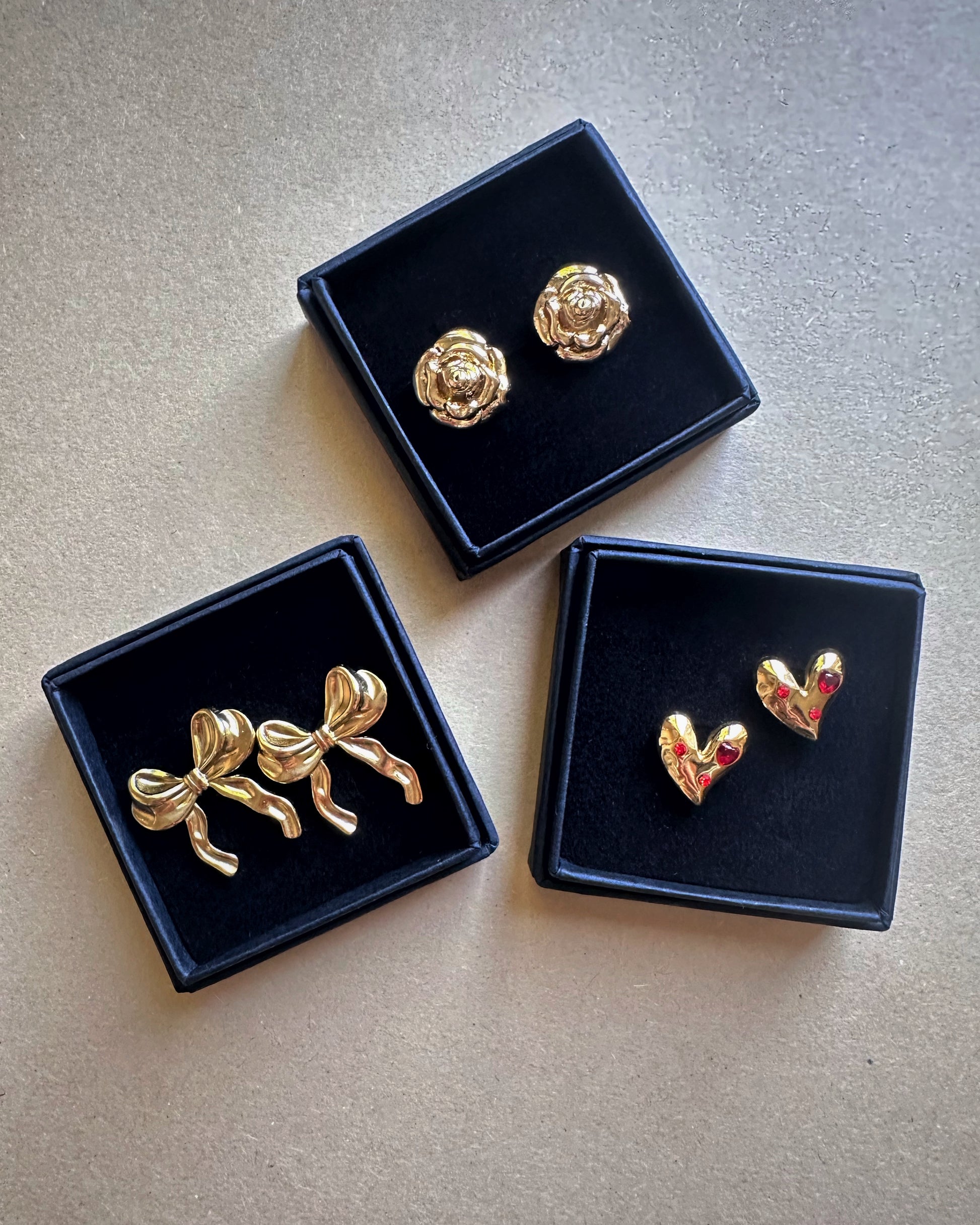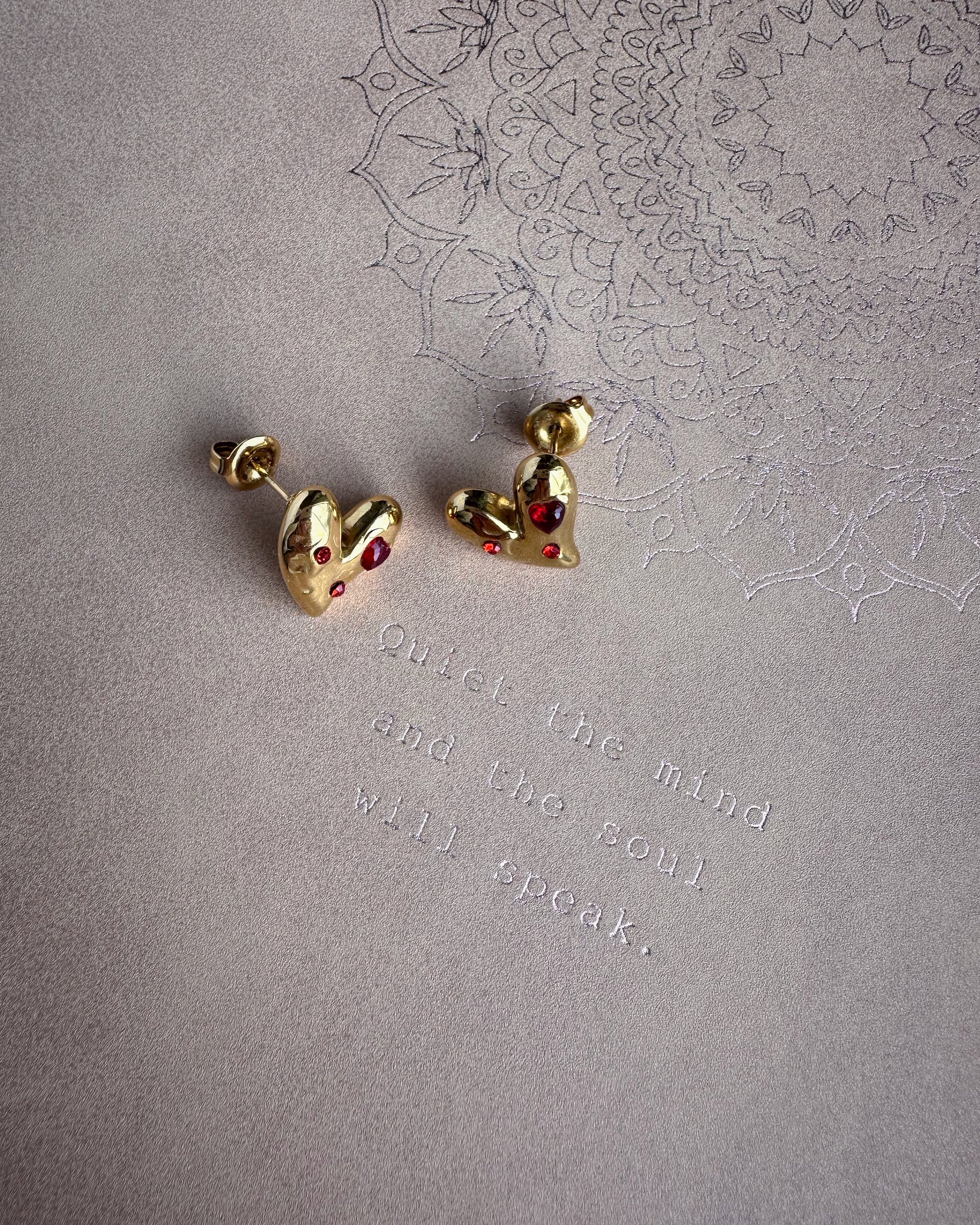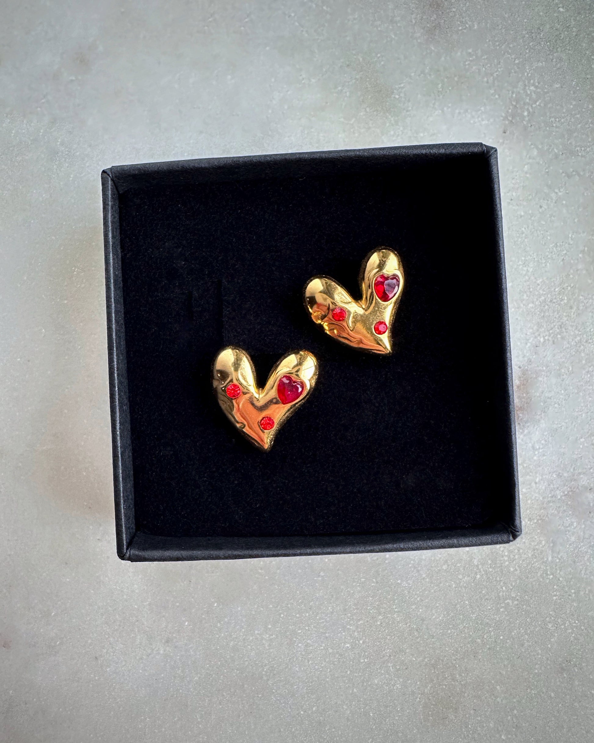 Stainless steel heart shaped stud earrings with Ruby rhinestone hears.