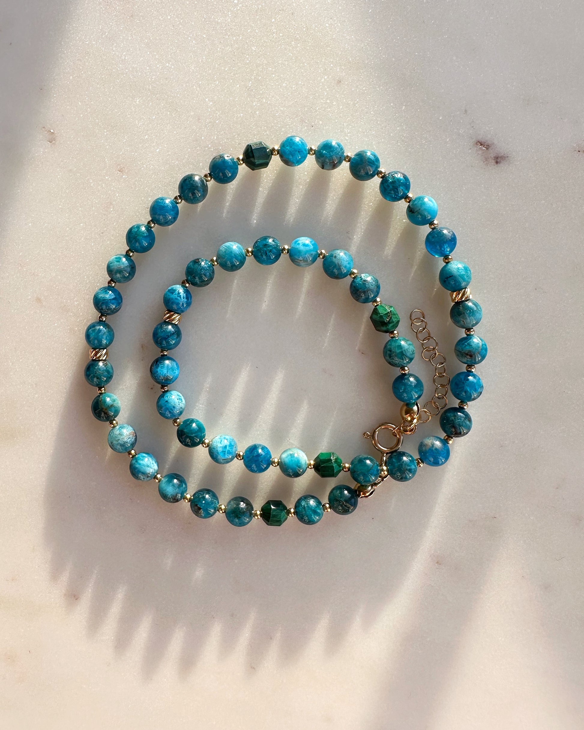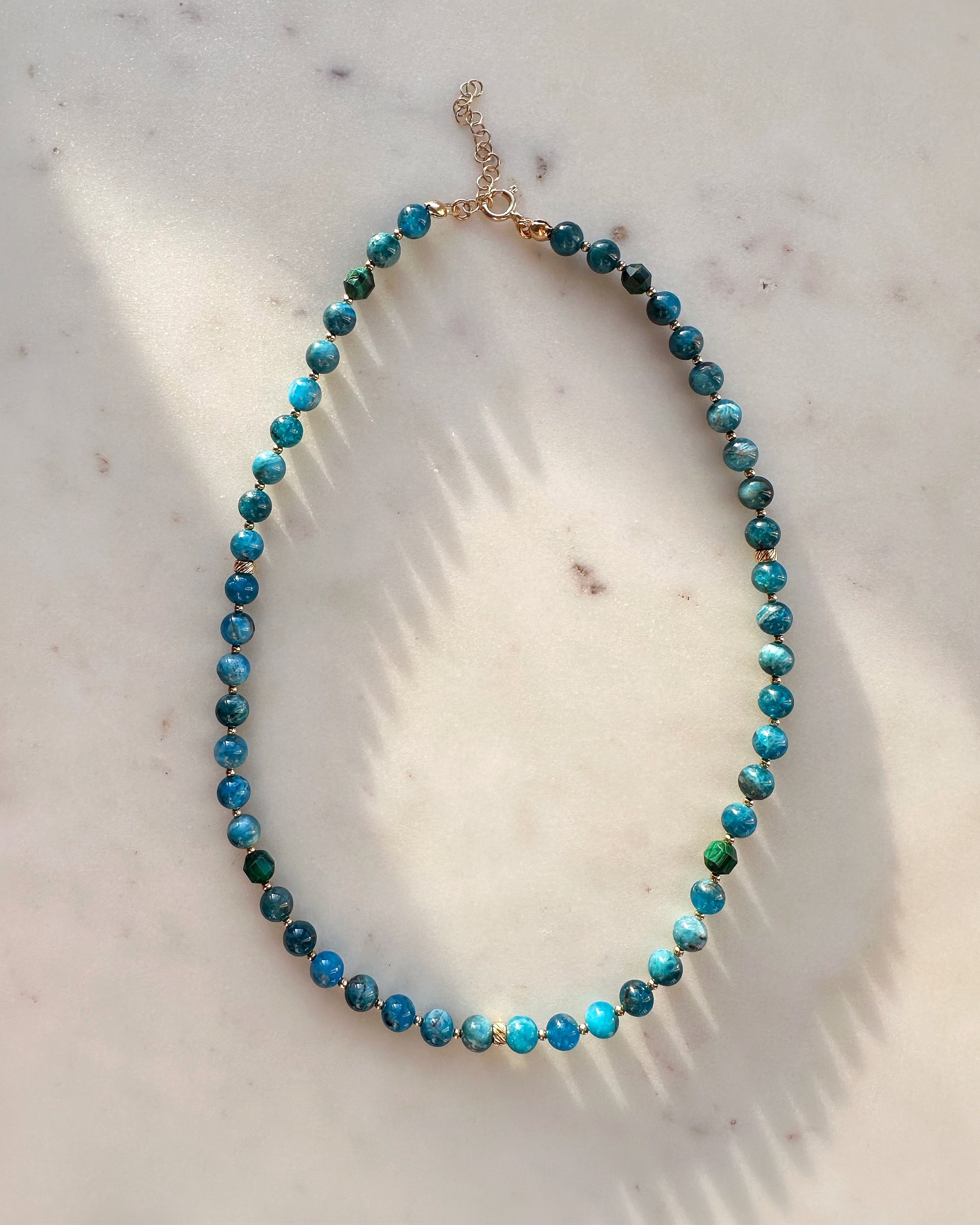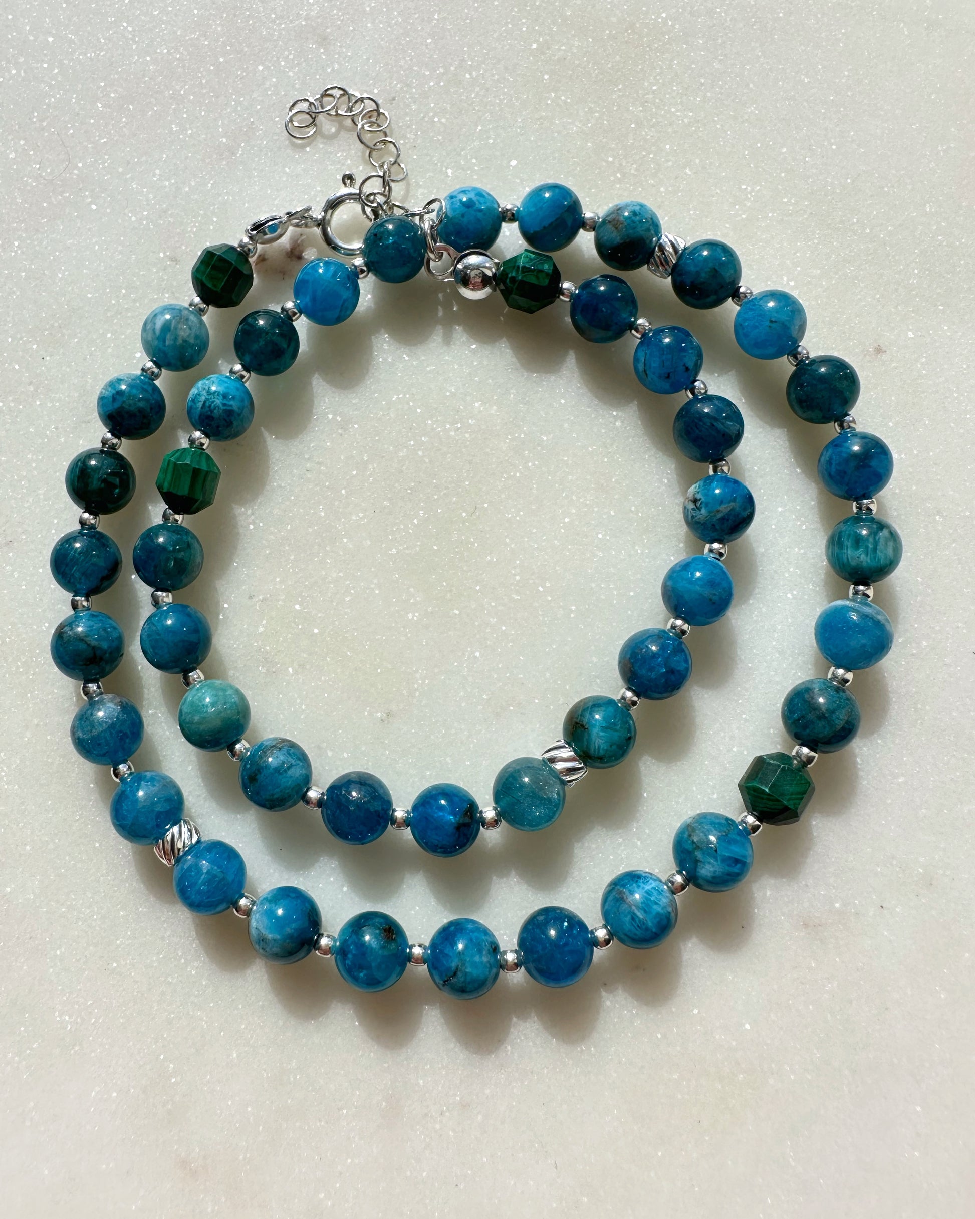 ISLA necklace with beautiful deep blue Apatite and 4 beads of green Matachite crystals.