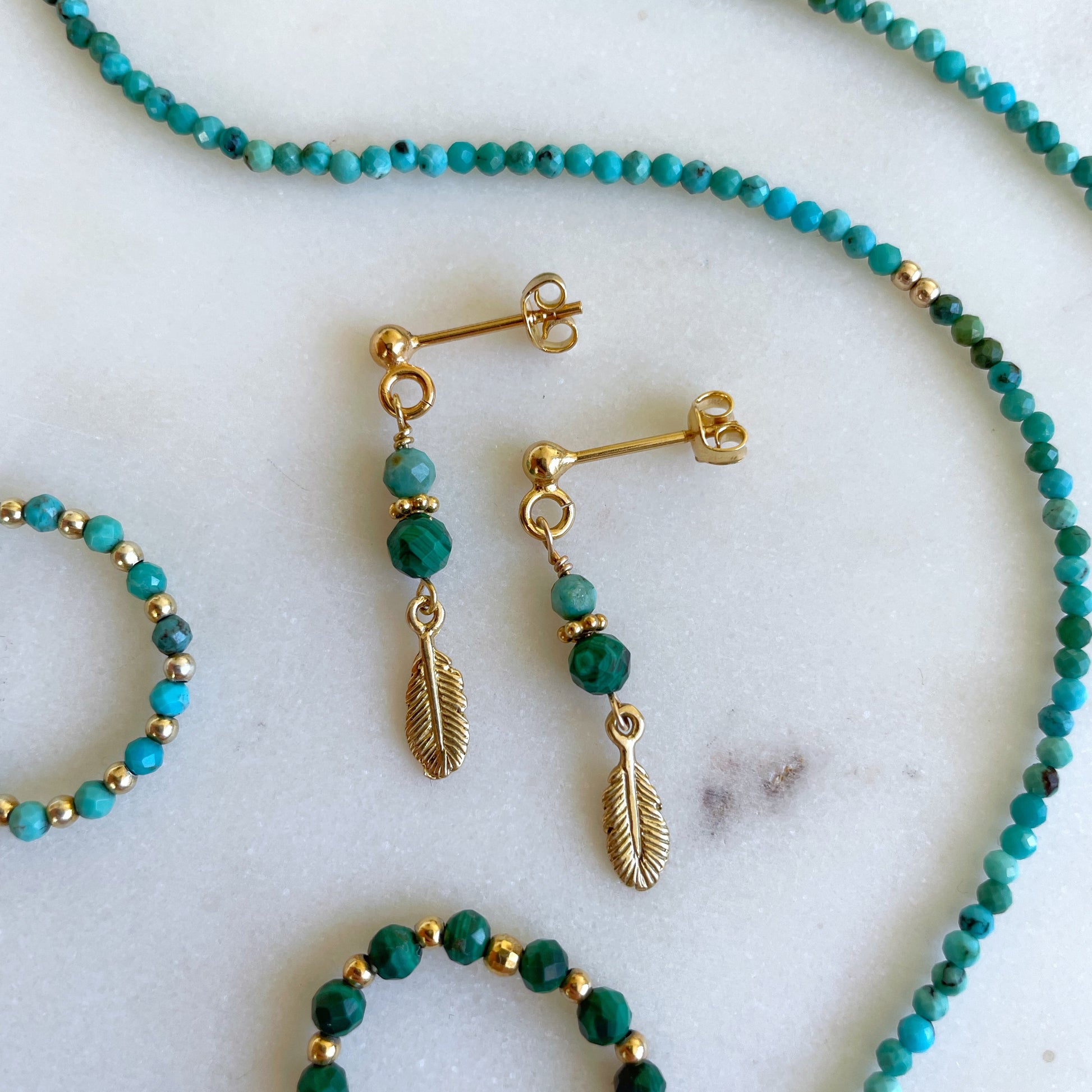Material used: African Turquoise, Malachite, sterling silver or gold plated sterling silver studs and elements.