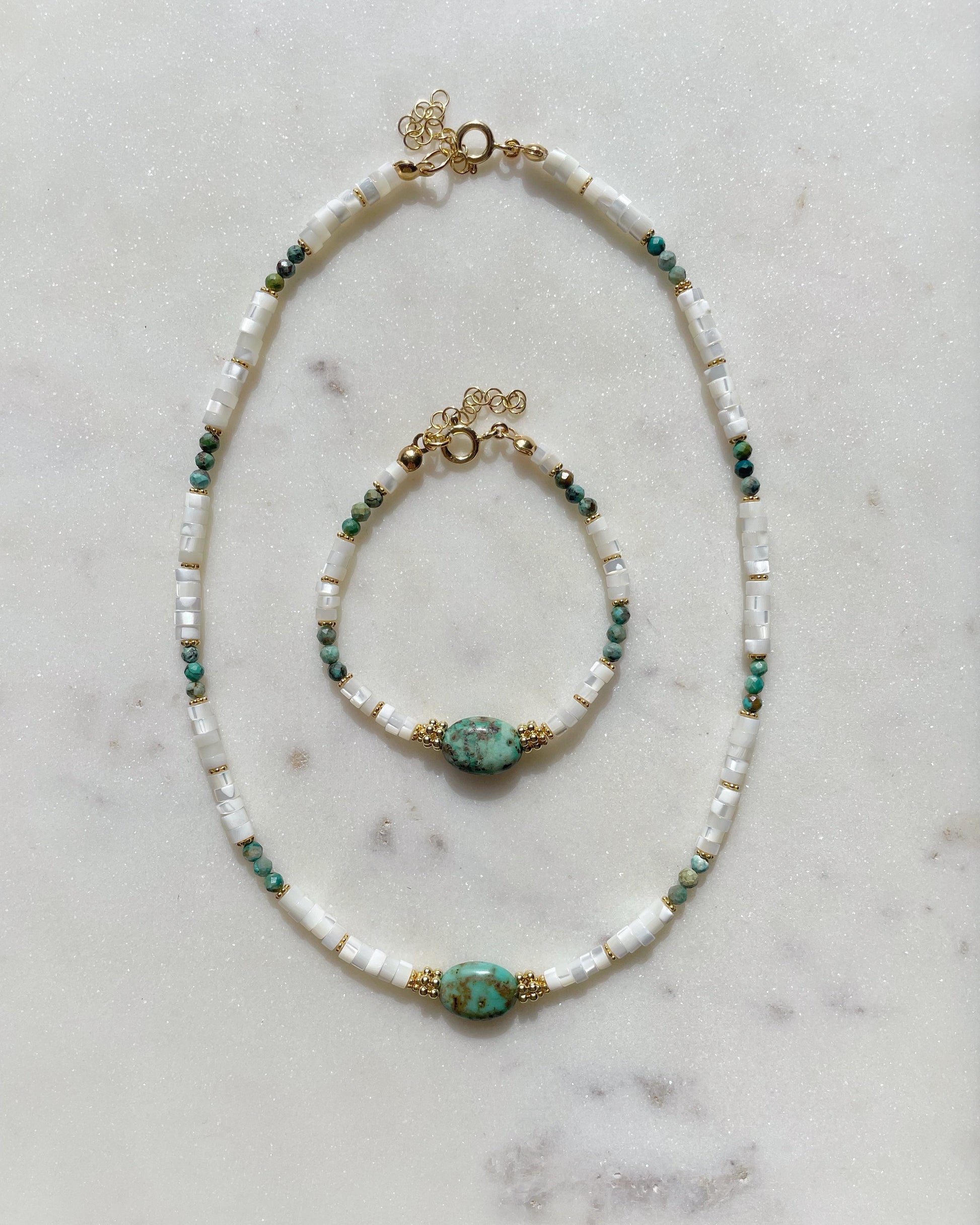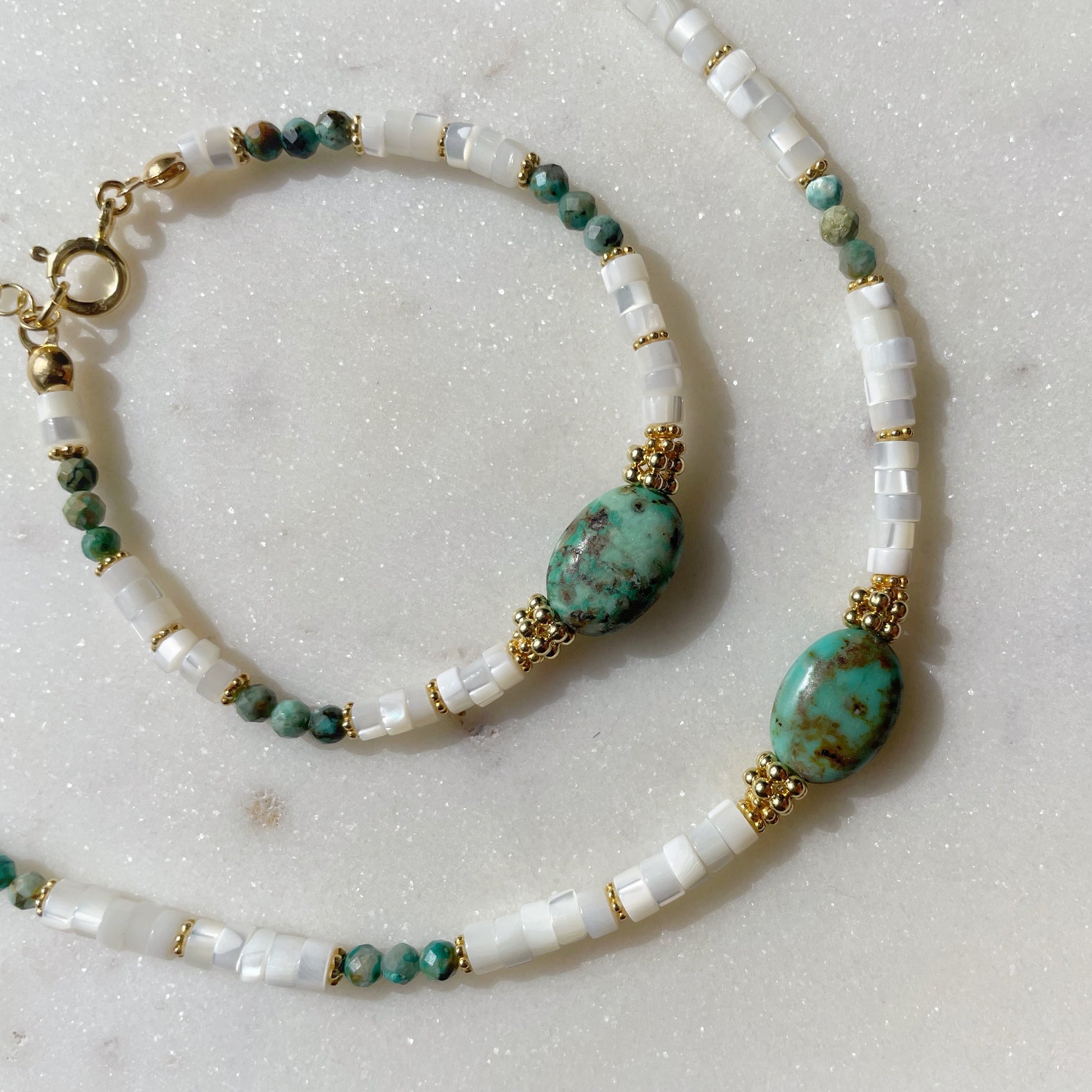 Ezili necklace and bracelet set with natural African turquoise (jasper) and white shell heishi beads.