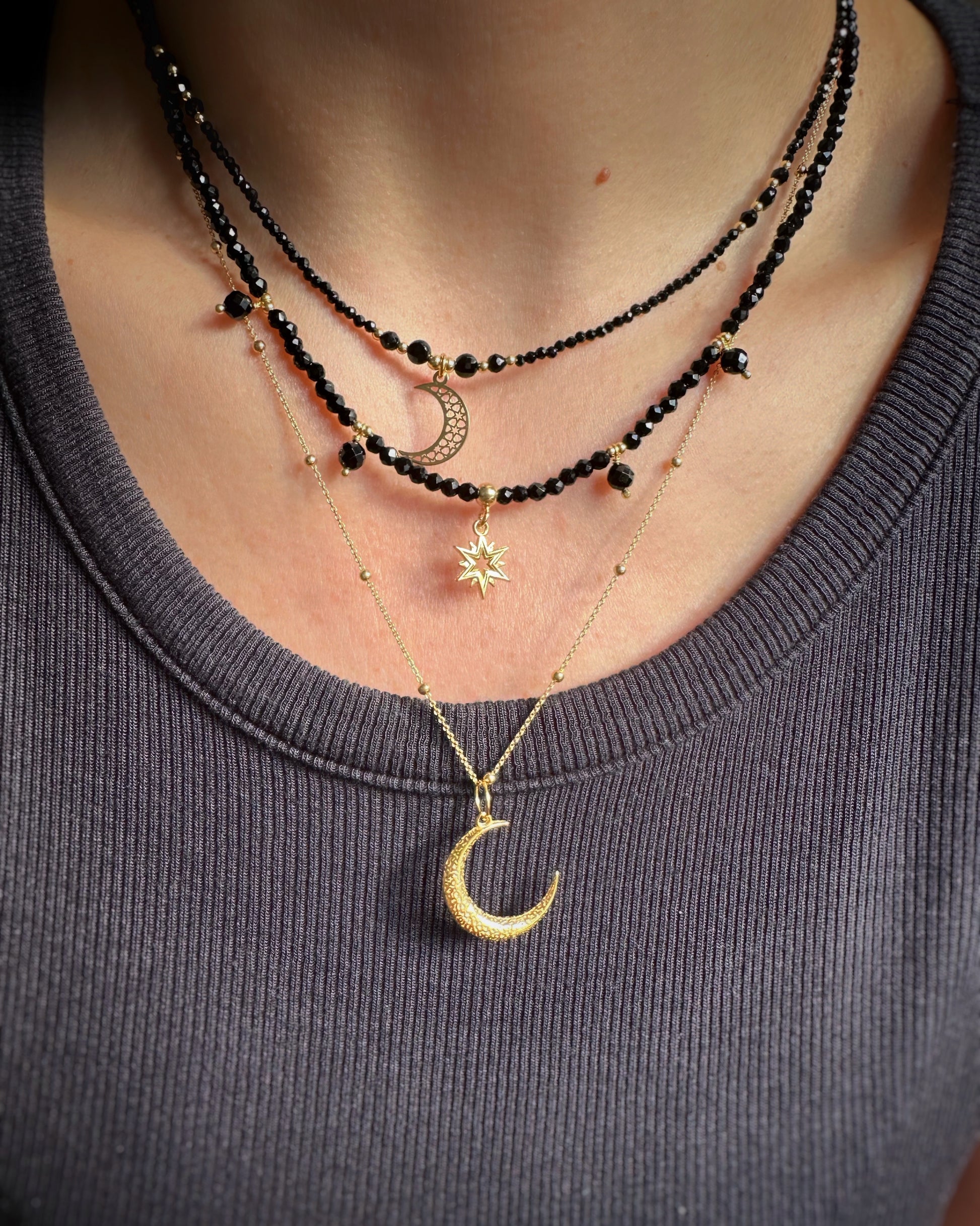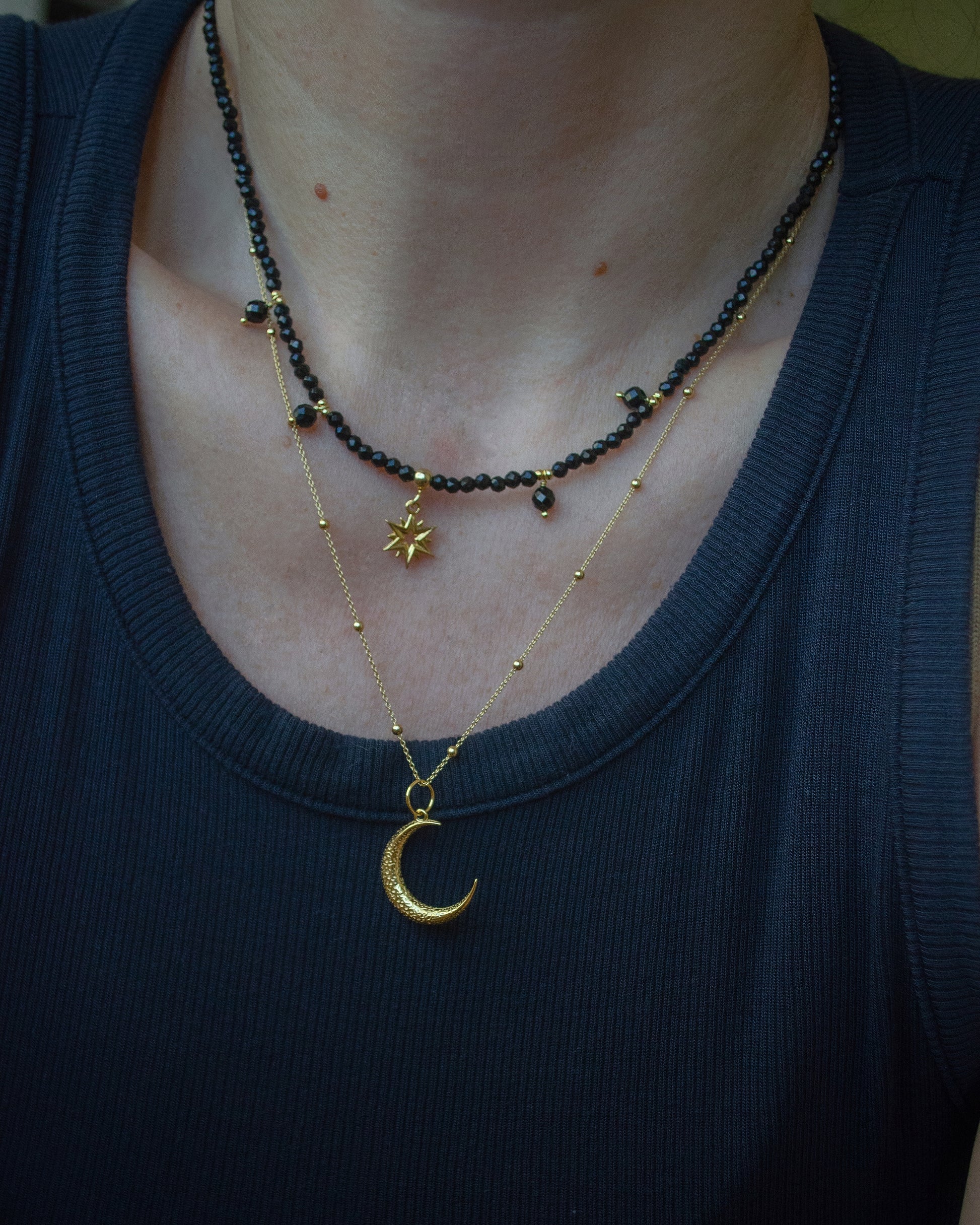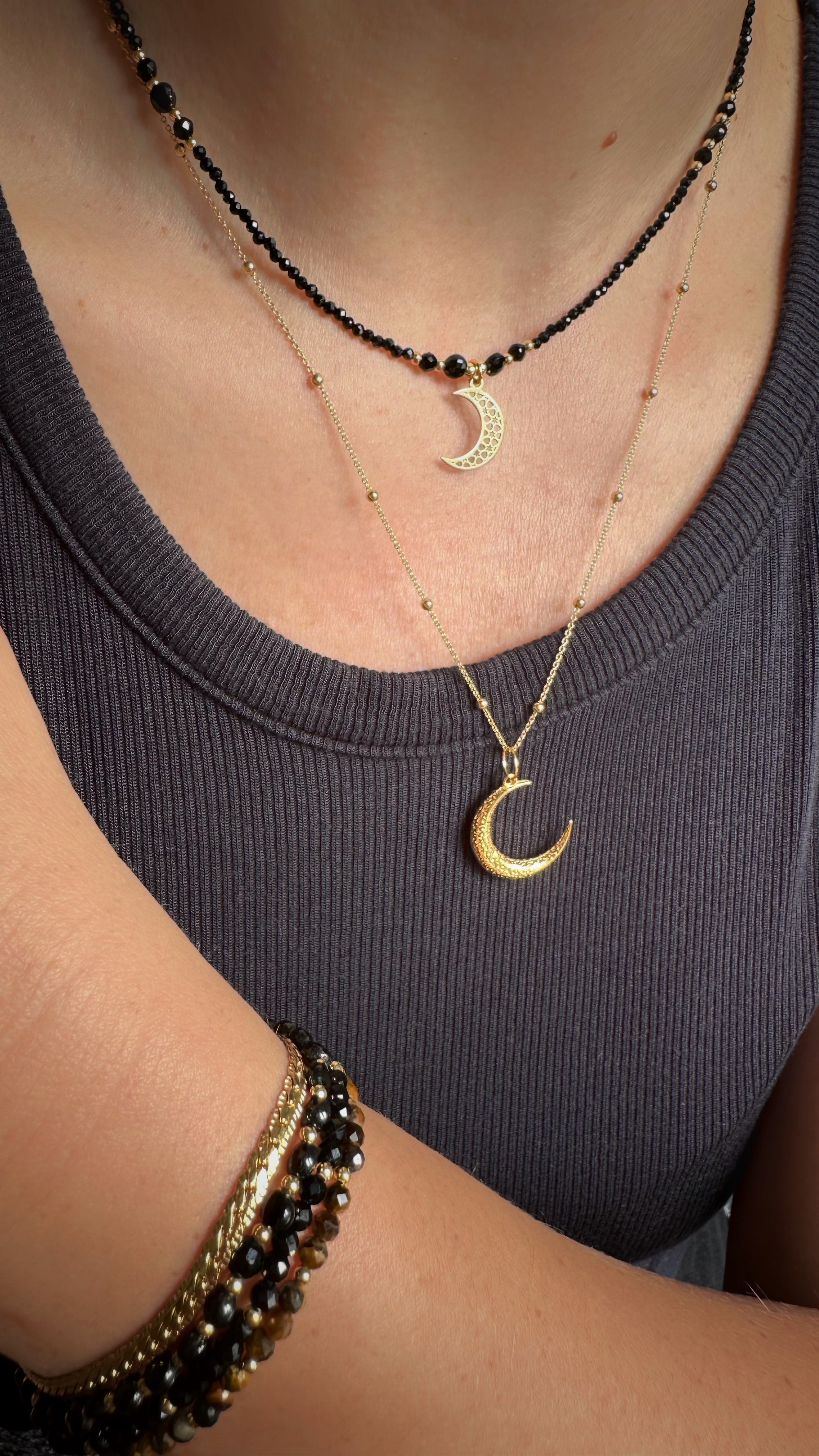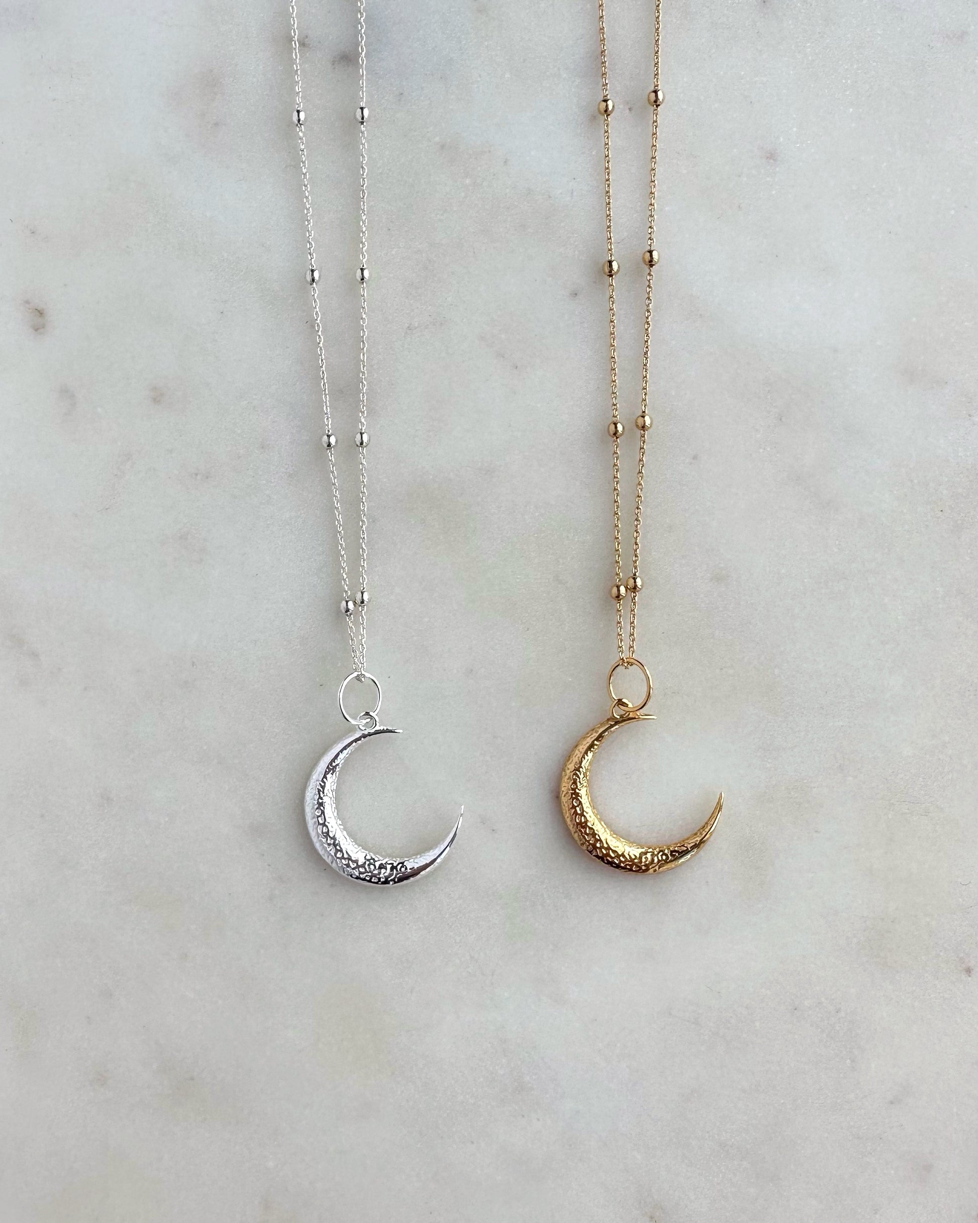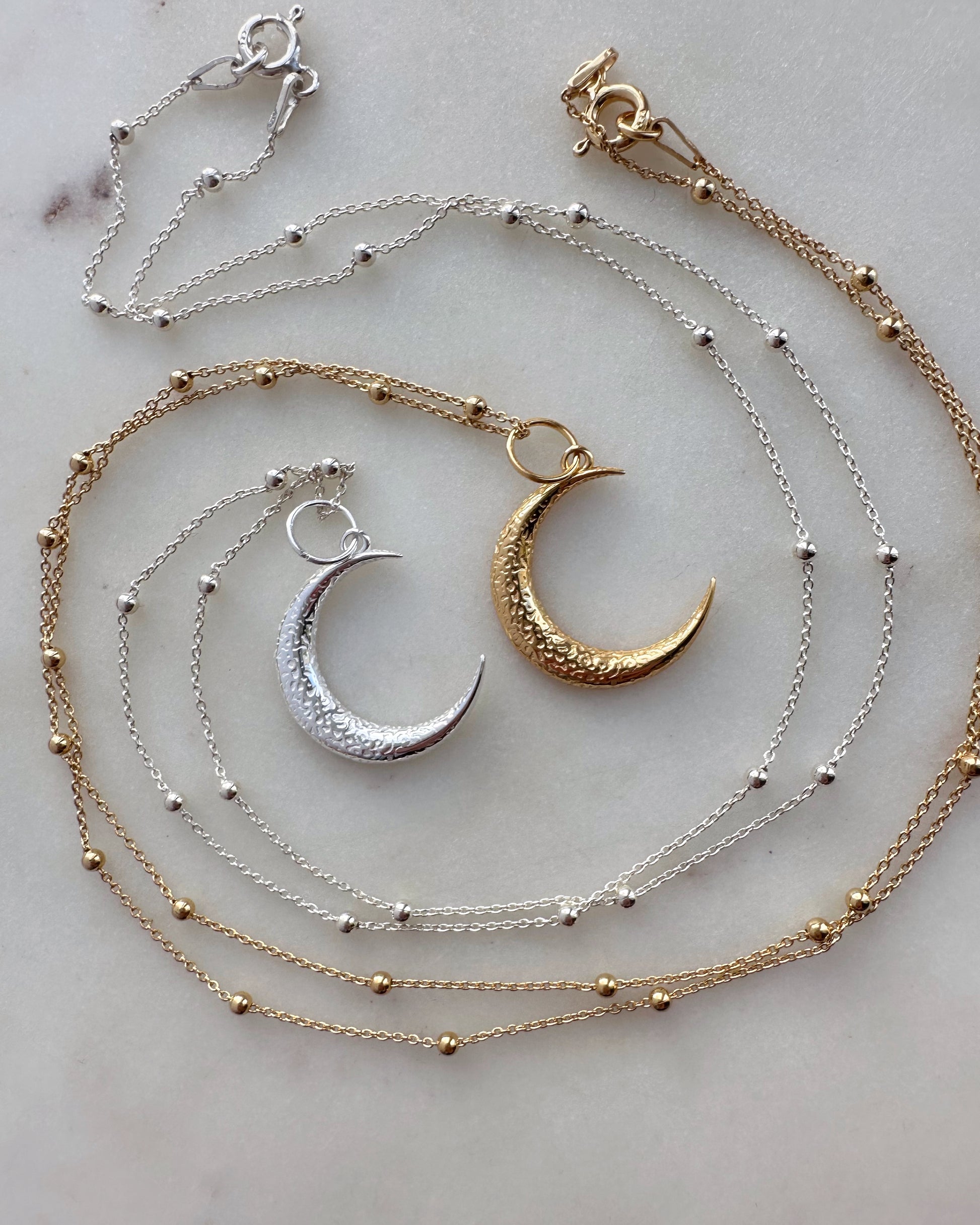 Luna necklace with crescent moon pendant on satellite ball chain.