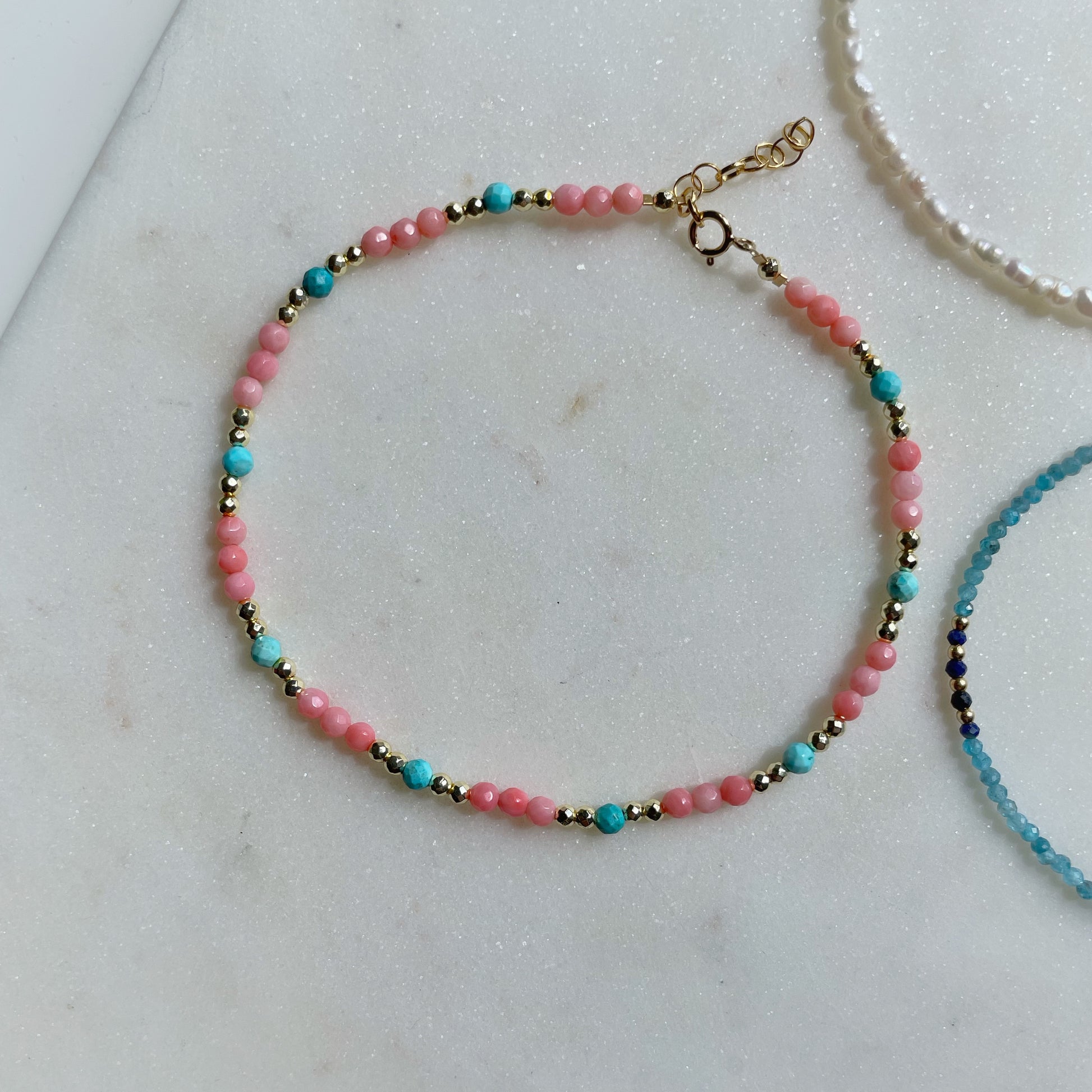 Pink coral, blue turquoise and shiny hematite beads creates this colourful summery anklet.
