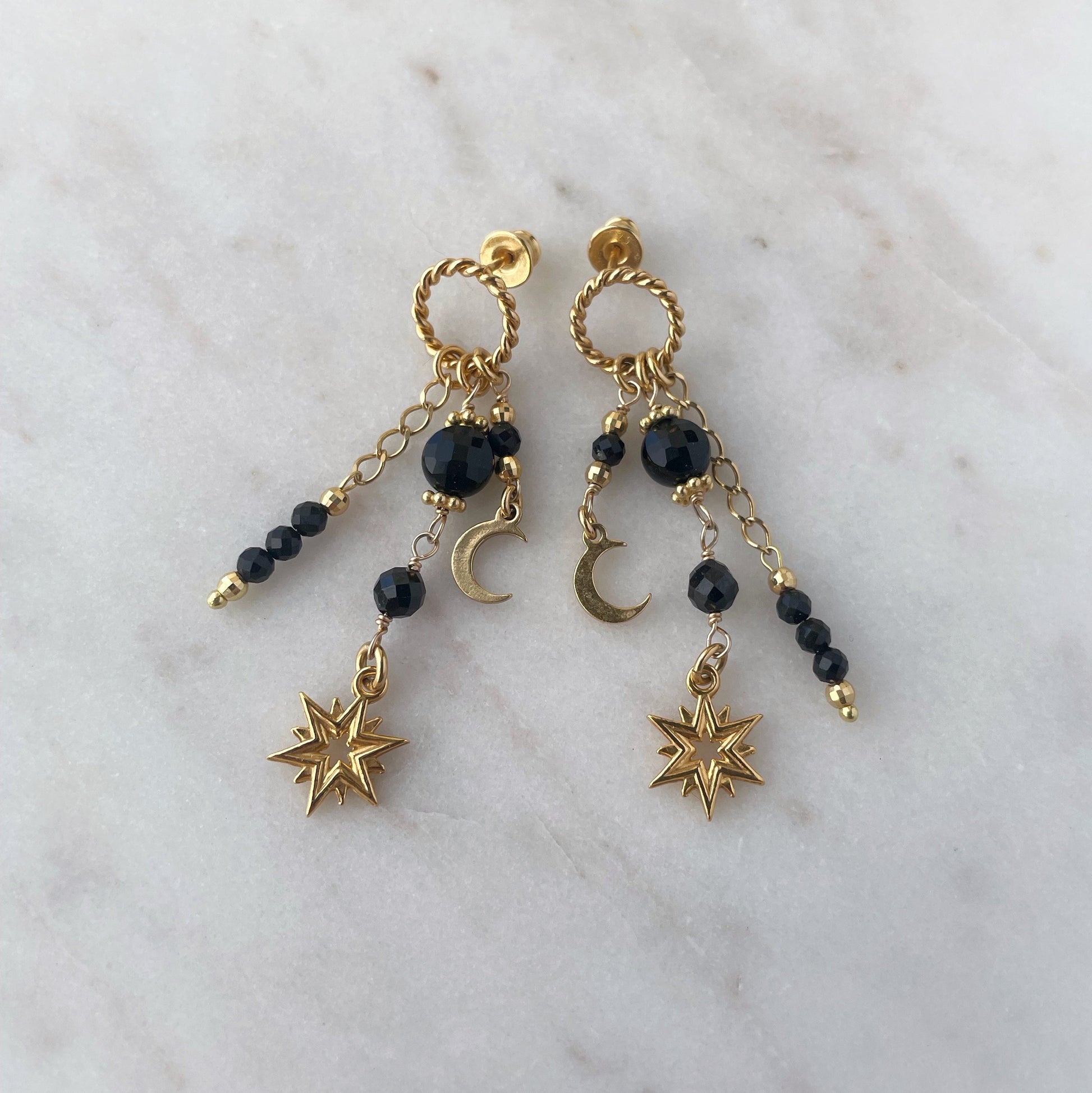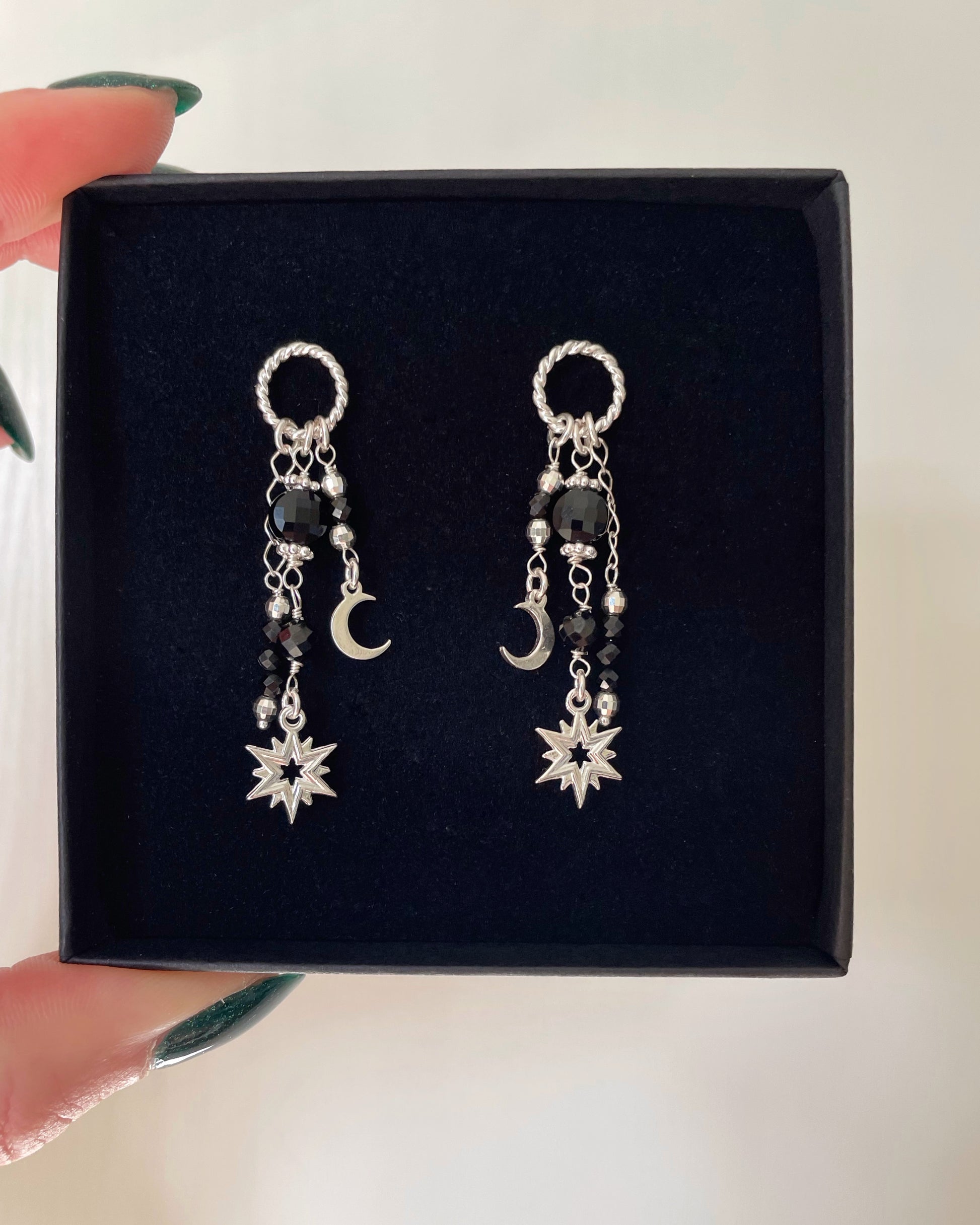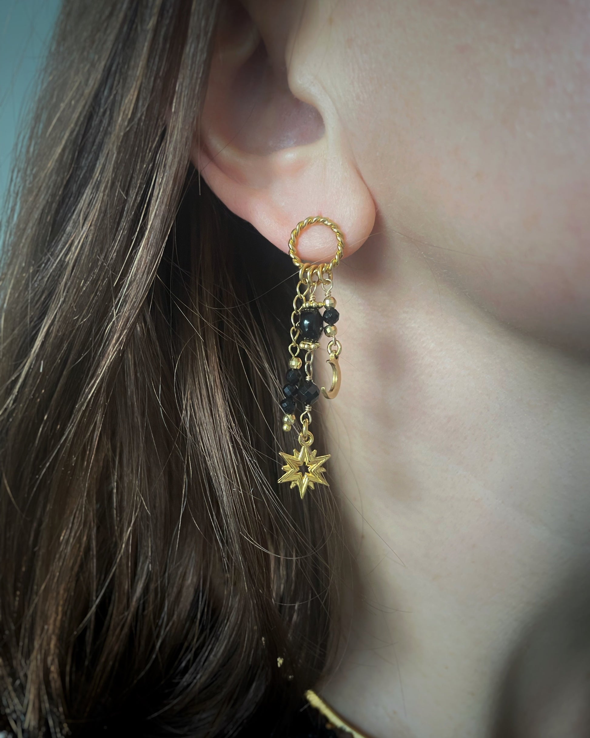 Stud earrings with natural black crystals: Onyx and Spinel.