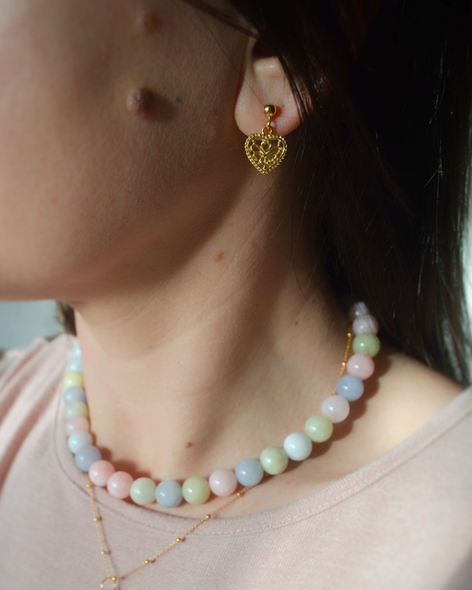 Romance earrings with beautiful heart pendants dangling on ball studs.