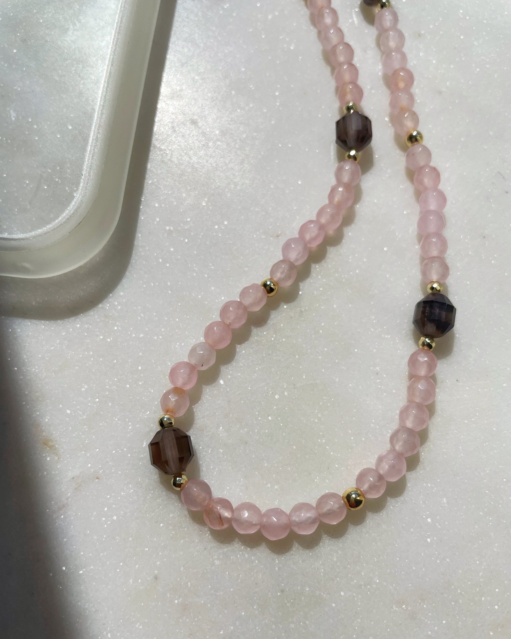 Combination of Rose Quartz, Hematite and Smoke Quartz.