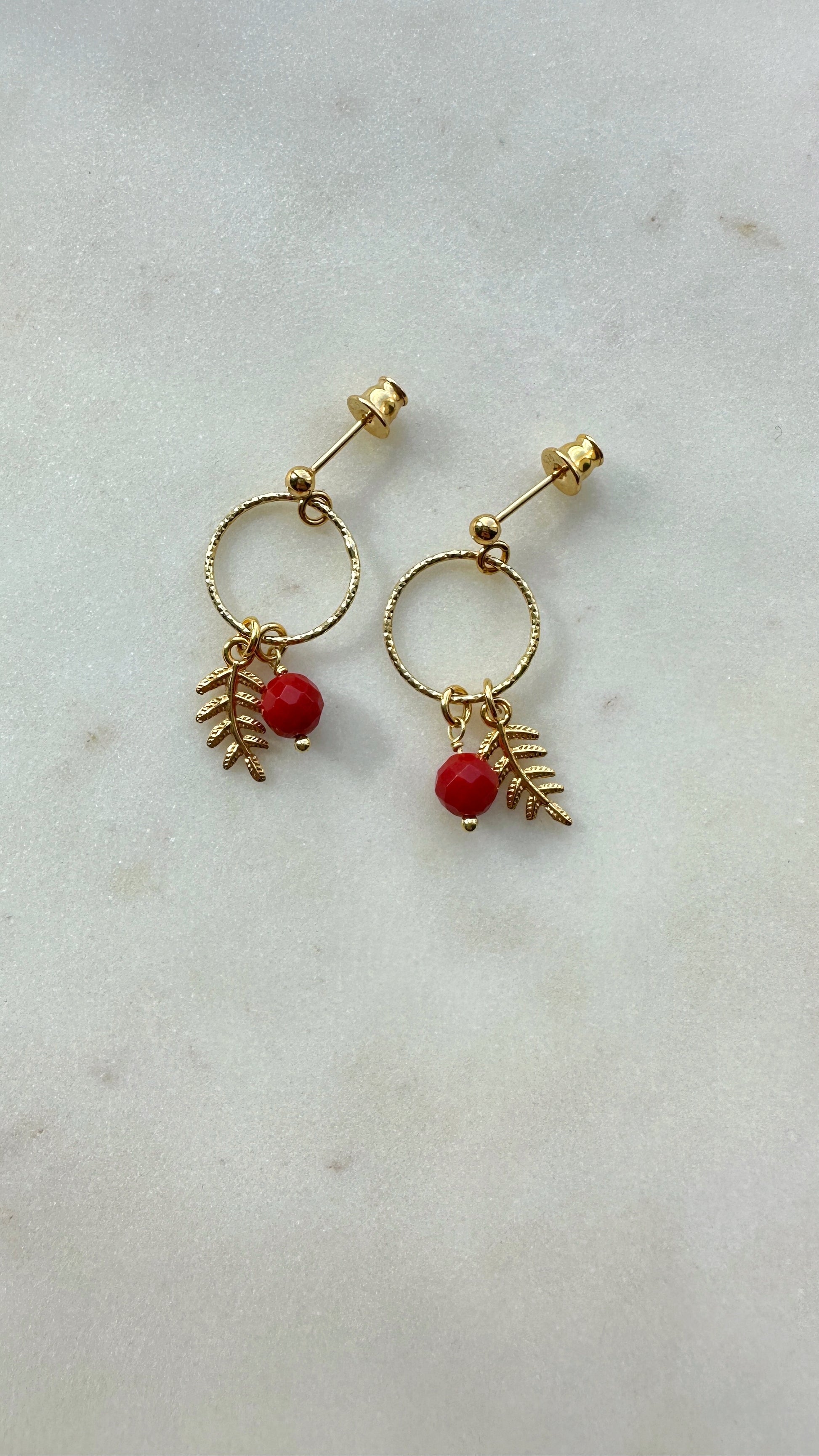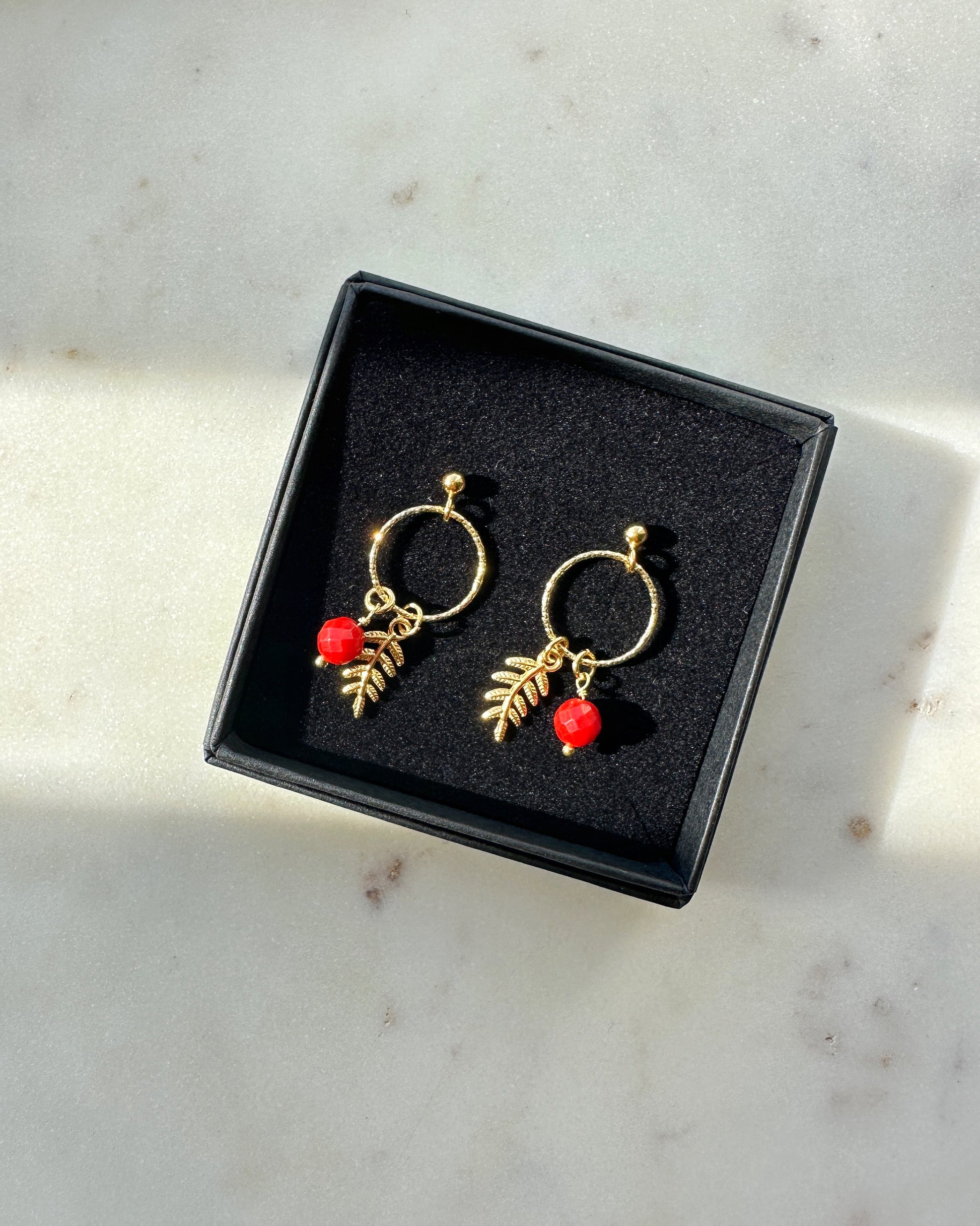 Stud earrings with natural Red Jasper gemstones and leaf charm dangling from sparkly circle.