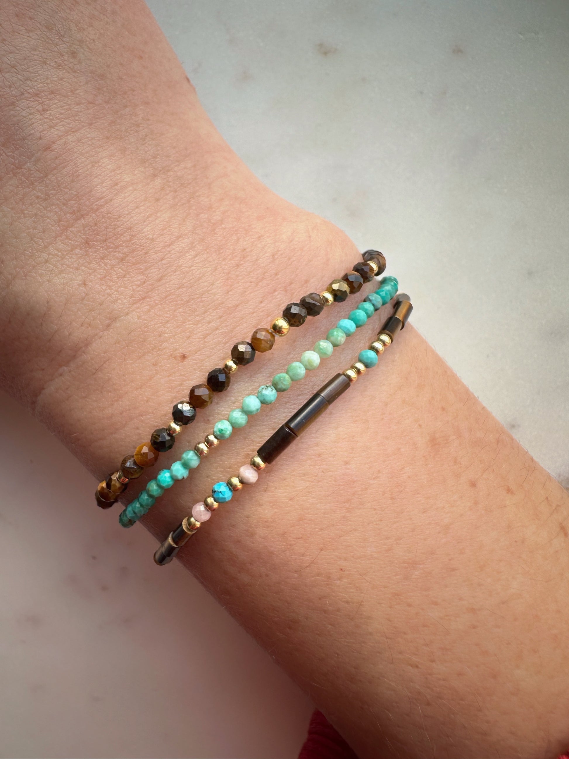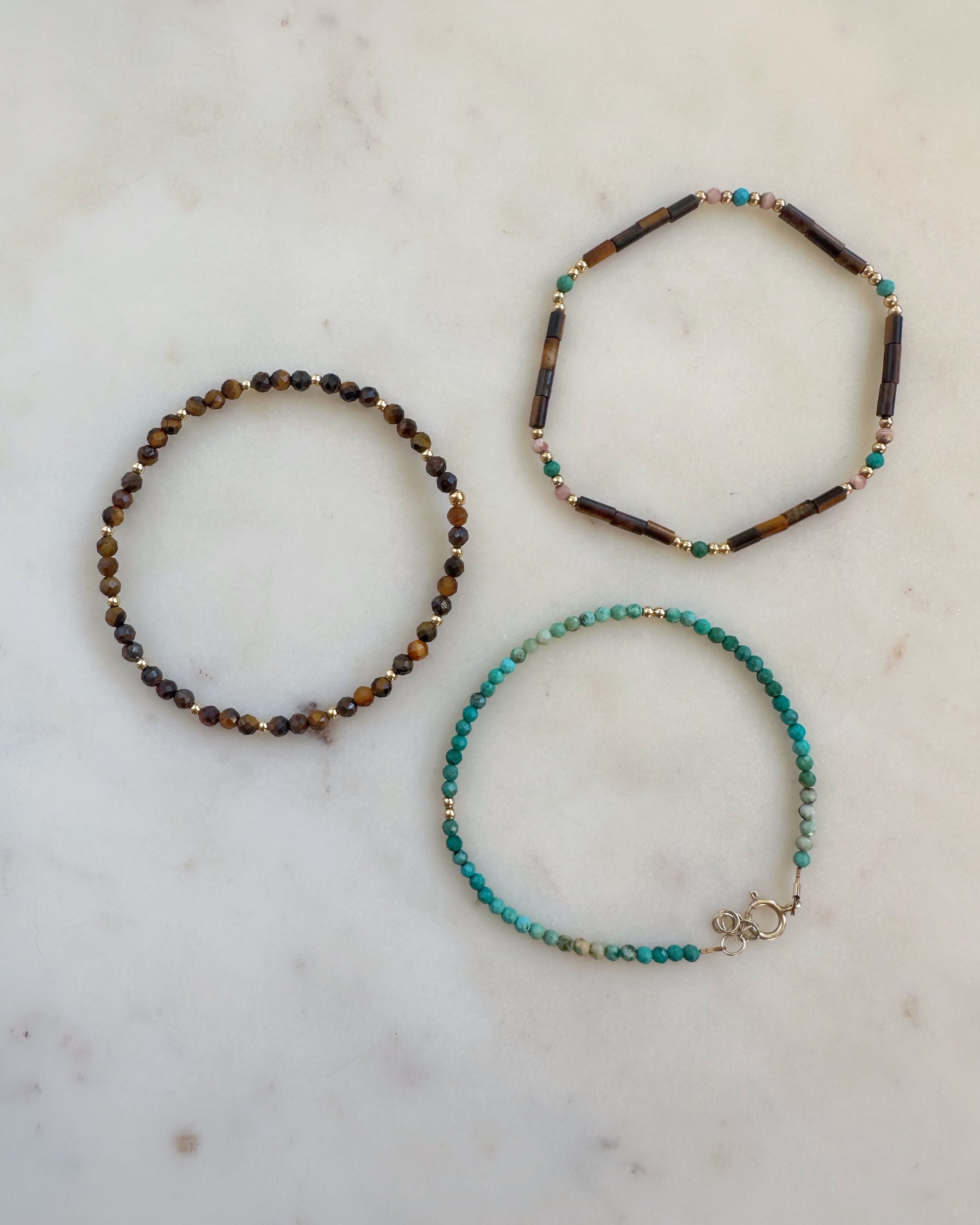 The Natural Turquoise provides a protective shield, Tiger Eye empowers with strength and focus, while Rhodochrosite nurtures emotional healing and self-love. Wear this crystal combo as a talisman for overall well-being and a reminder of the beauty and power found in the natural world.