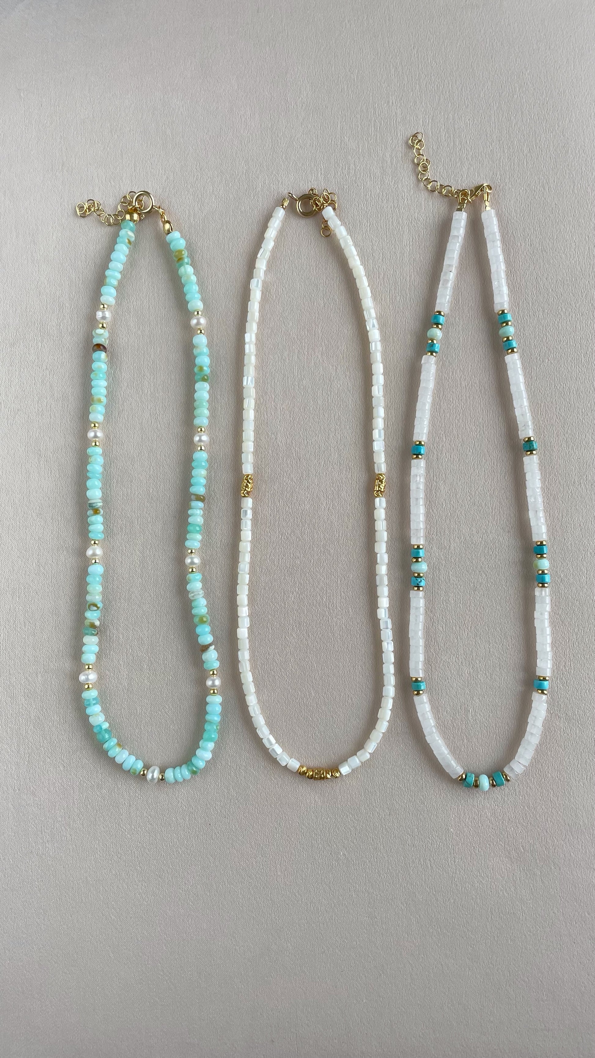 One of the most remarkable features of this necklace is how it complements sun-kissed skin. The light blue turquoise tones of the Peruvian opals are reminiscent of the ocean, and when paired with the luminous white of the freshwater pearls, they create a stunning contrast that is sure to turn heads. Whether you're wearing a sundress or a swimsuit, this necklace is the perfect finishing touch to any summer outfit.